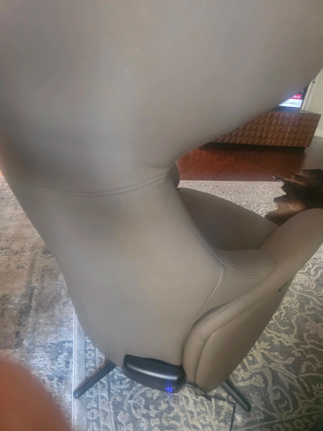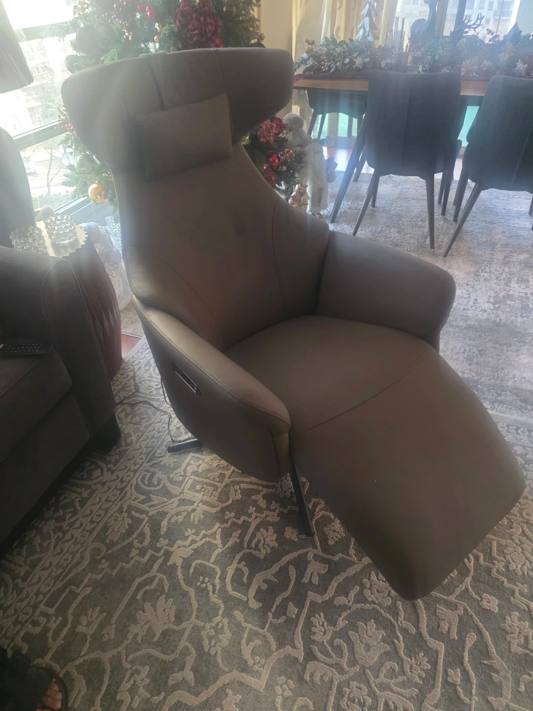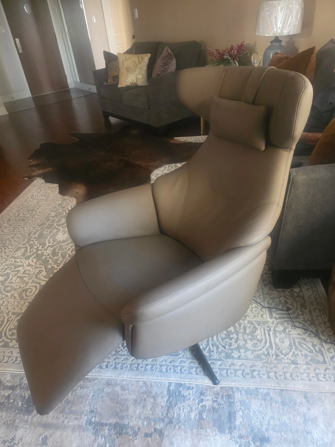 Selling a comfy leather recliner chair! It's in great shape and would be perfect for a living room or den. It features a headrest and a reclining function for ultimate relaxation. The chair is a neutral colour that would fit in with most decor styles