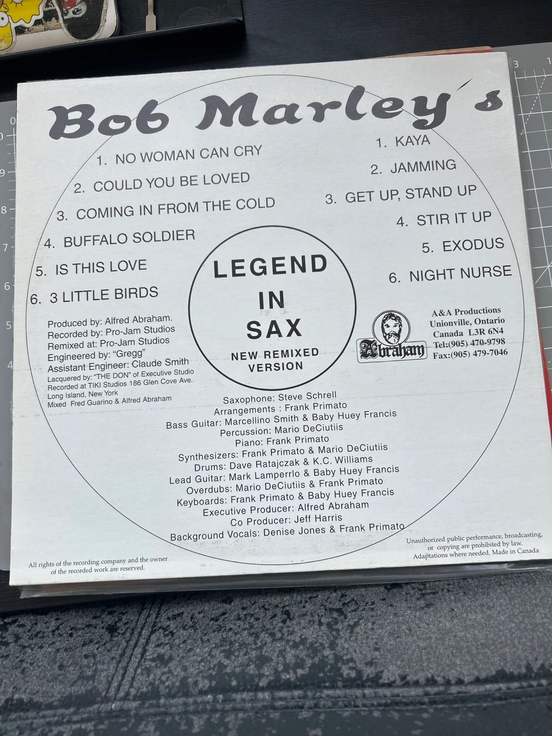 Selling a Bob Marley's Legend in Sax vinyl record. It appears to be a new remixed version. A&A Productions, Unionville, Ontario, Canada. Produced by Alfred Abraham. This vinyl includes songs like No Woman Can Cry, Could You Be Loved, and Jamming