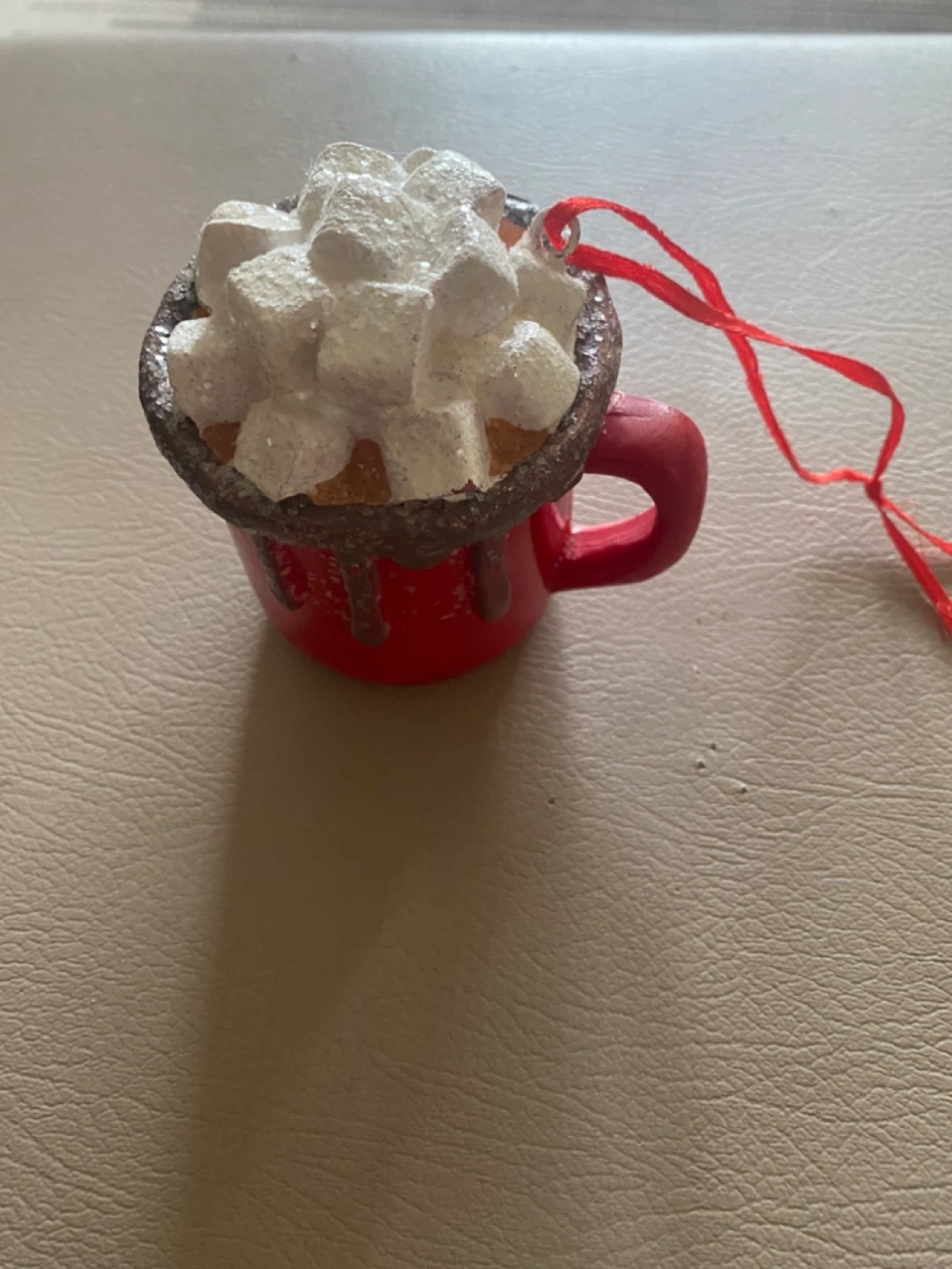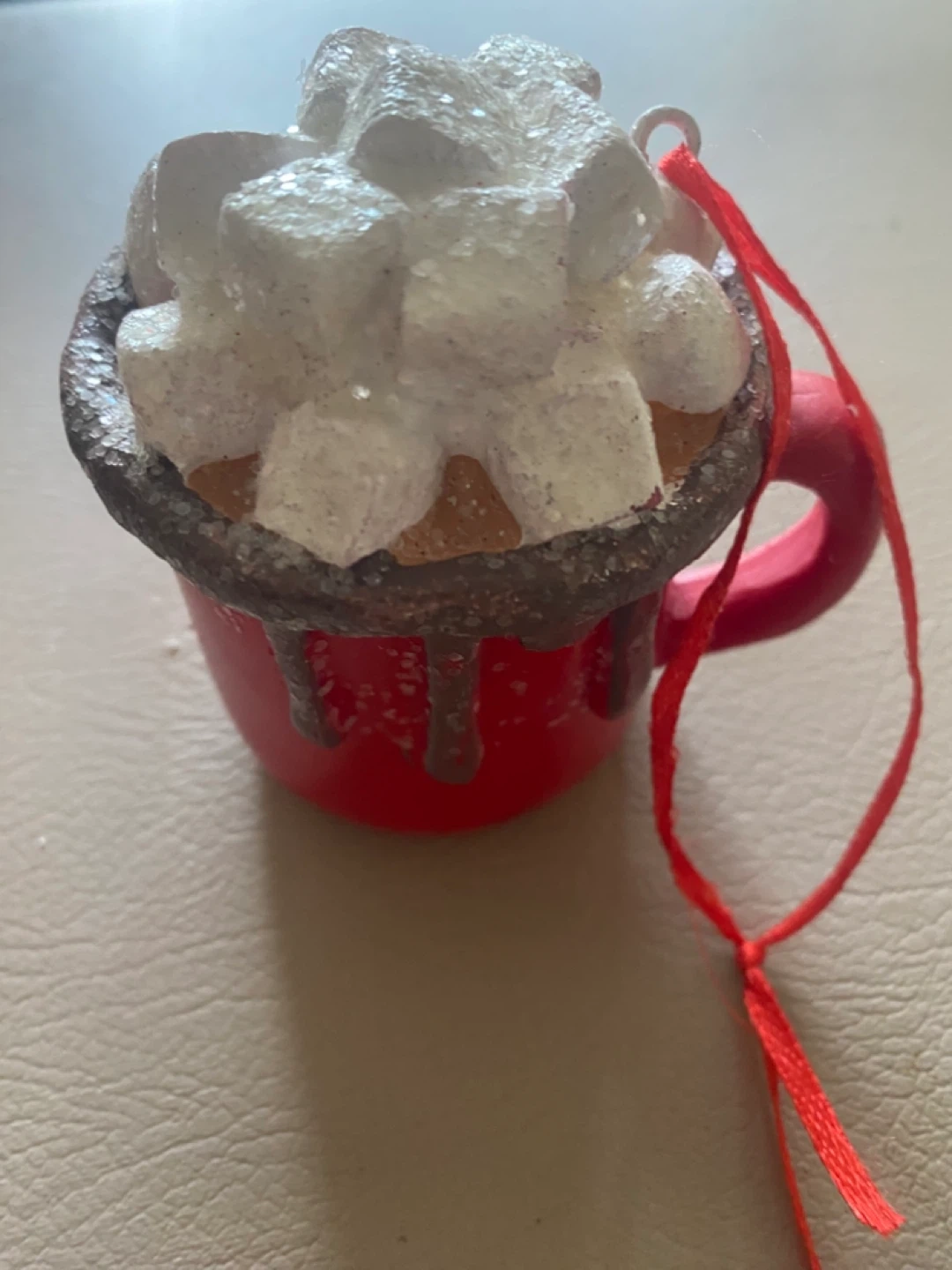 Here's a cute hot chocolate Christmas ornament! It's a festive addition to any tree or holiday display. The details are adorable, from the red mug to the marshmallow topping. Perfect for adding a touch of warmth and sweetness to your holiday decor