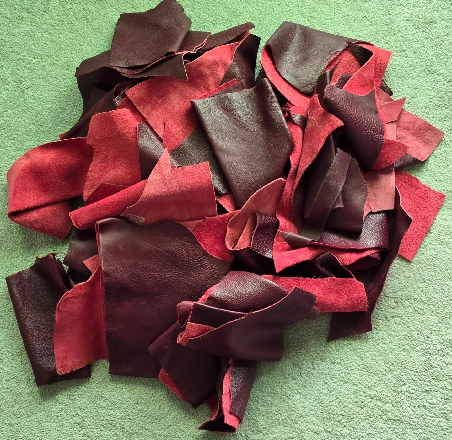 Over 10 pounds of genuine burgundy leather scraps.
