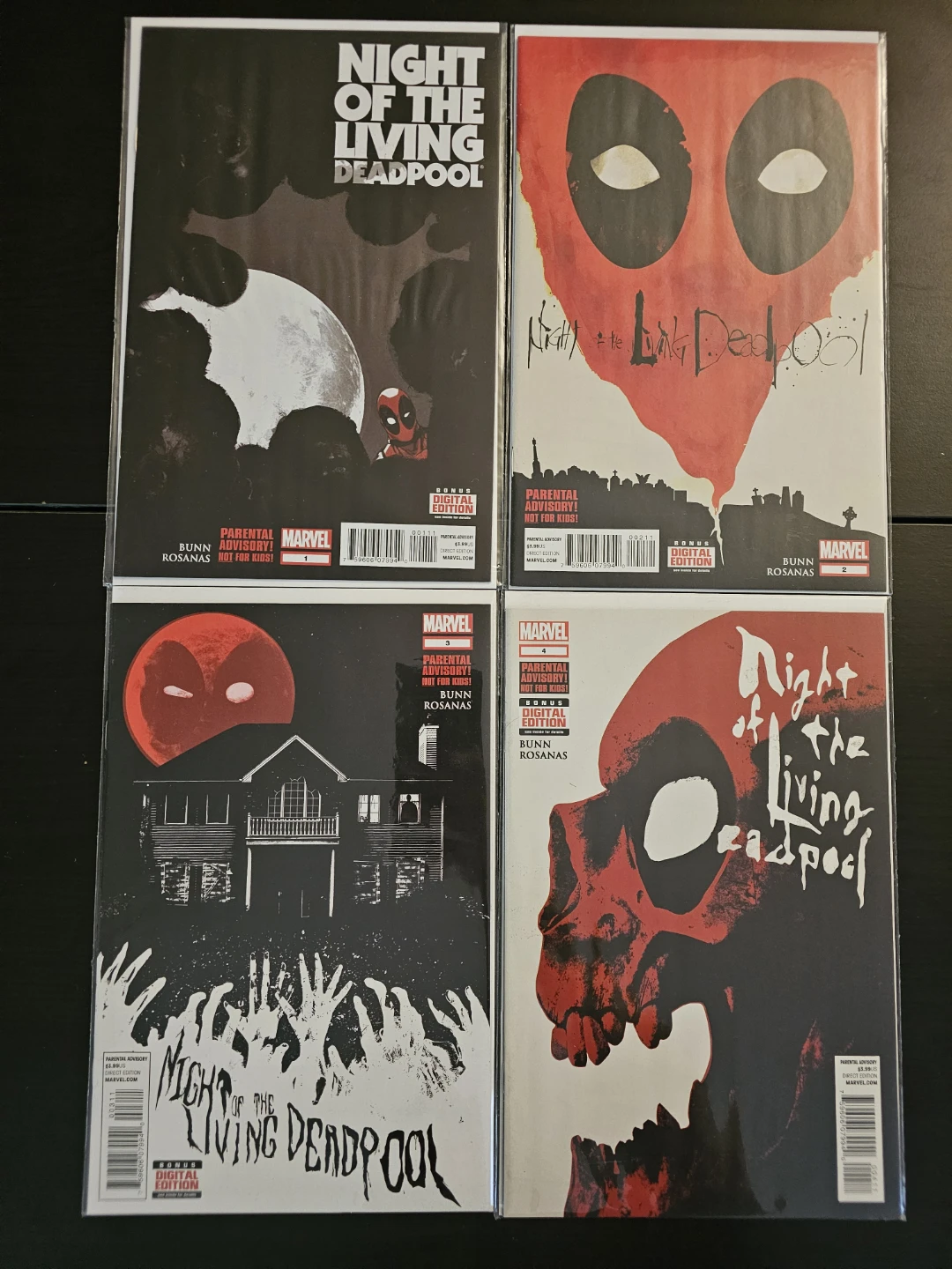 I'm offering a complete set of Night of the Living Deadpool comics, issues 1-4, from Marvel. These comics are in used condition but have been well-maintained. A must-have for any Deadpool or Marvel collector! As these are used, there may be minor wear and tear, but they are in good shape overall. Currently, similar issues are priced between $5-$20 each. If the ad's up, the comics are available – no need to ask, just excitement!