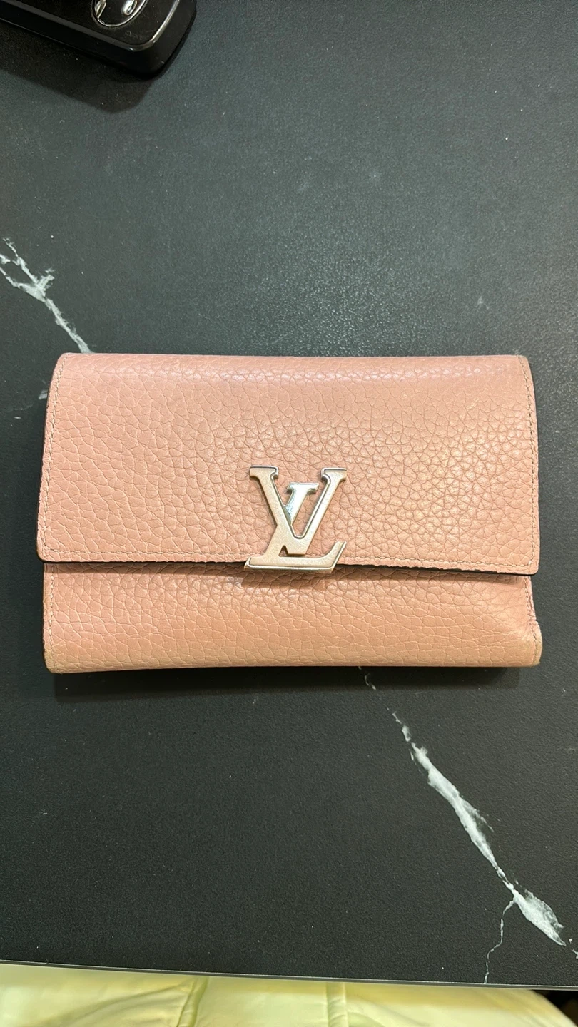Authentic Louis Vuitton Capucines wallet. Pink leather. Multiple card slots and compartments. Zip closure. Made in France. Pre-owned.