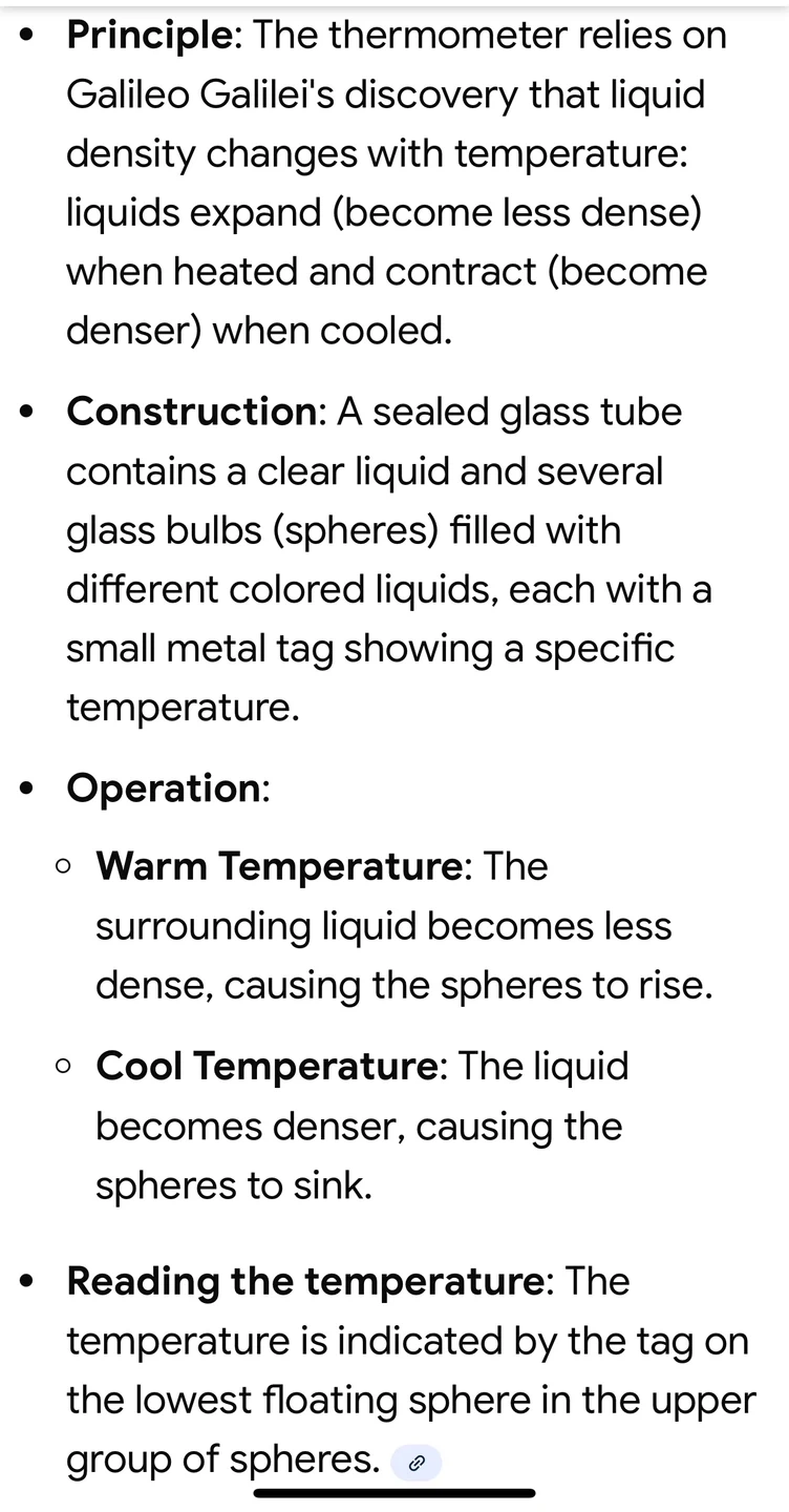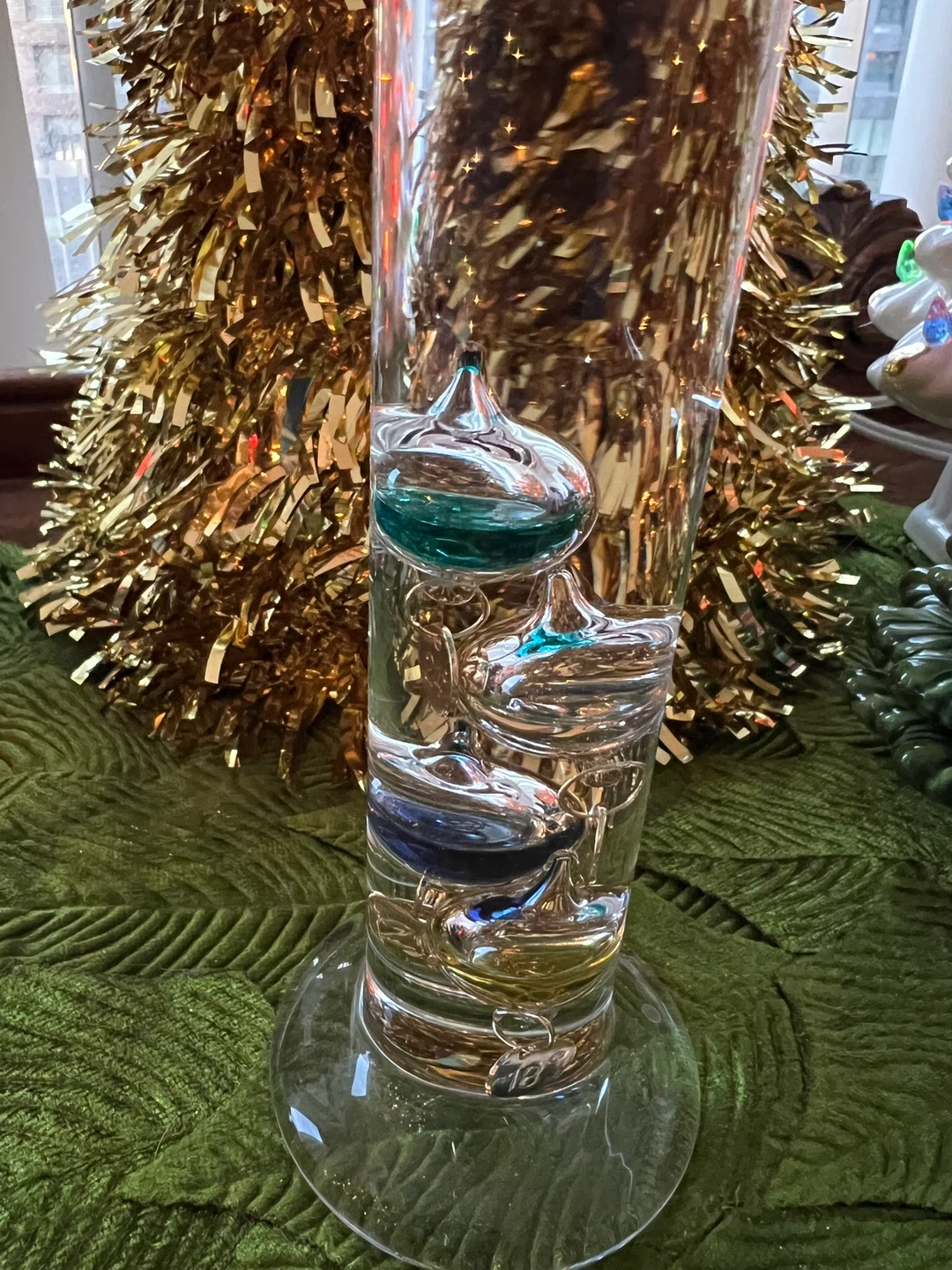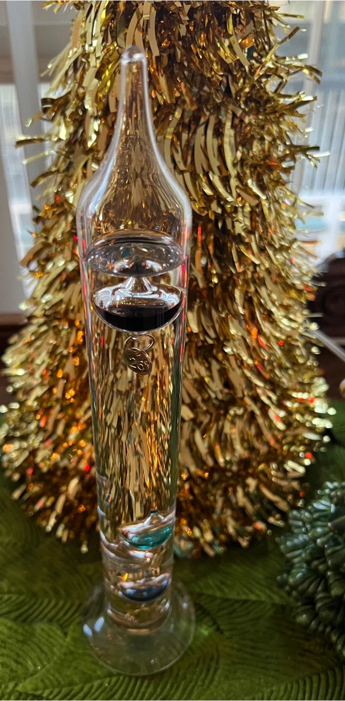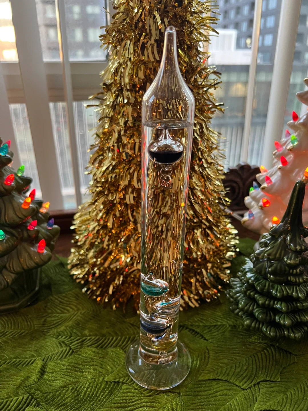 I'm selling a Galileo thermometer! It's a decorative scientific instrument and an artistic decor piece. It's generally accurate to within a few degrees for indoor use. The temperature range is typically from about 18°C to 26°C (64°F to 80°F)… 11” tall … no scratches
