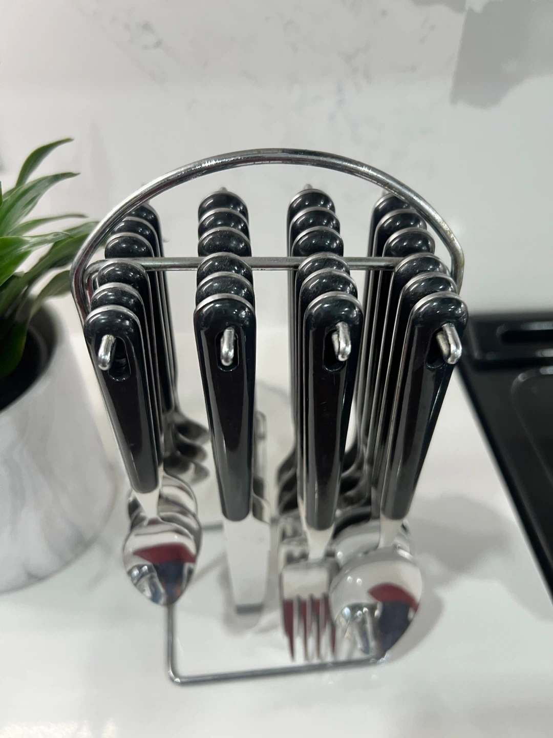 Selling a cutlery set with a stand. It includes forks, spoons, and knives, all neatly organized in a silver-tone stand. Great for keeping your kitchen organized and your utensils easily accessible