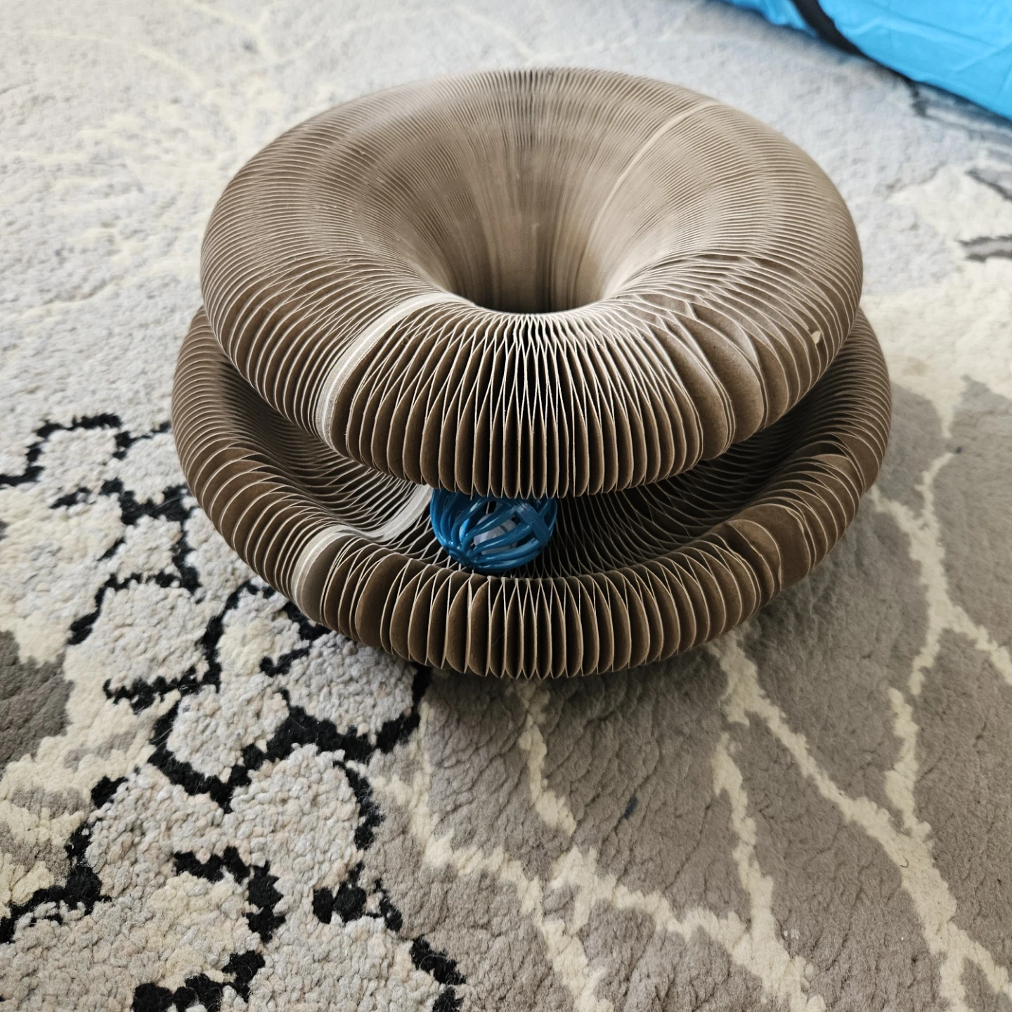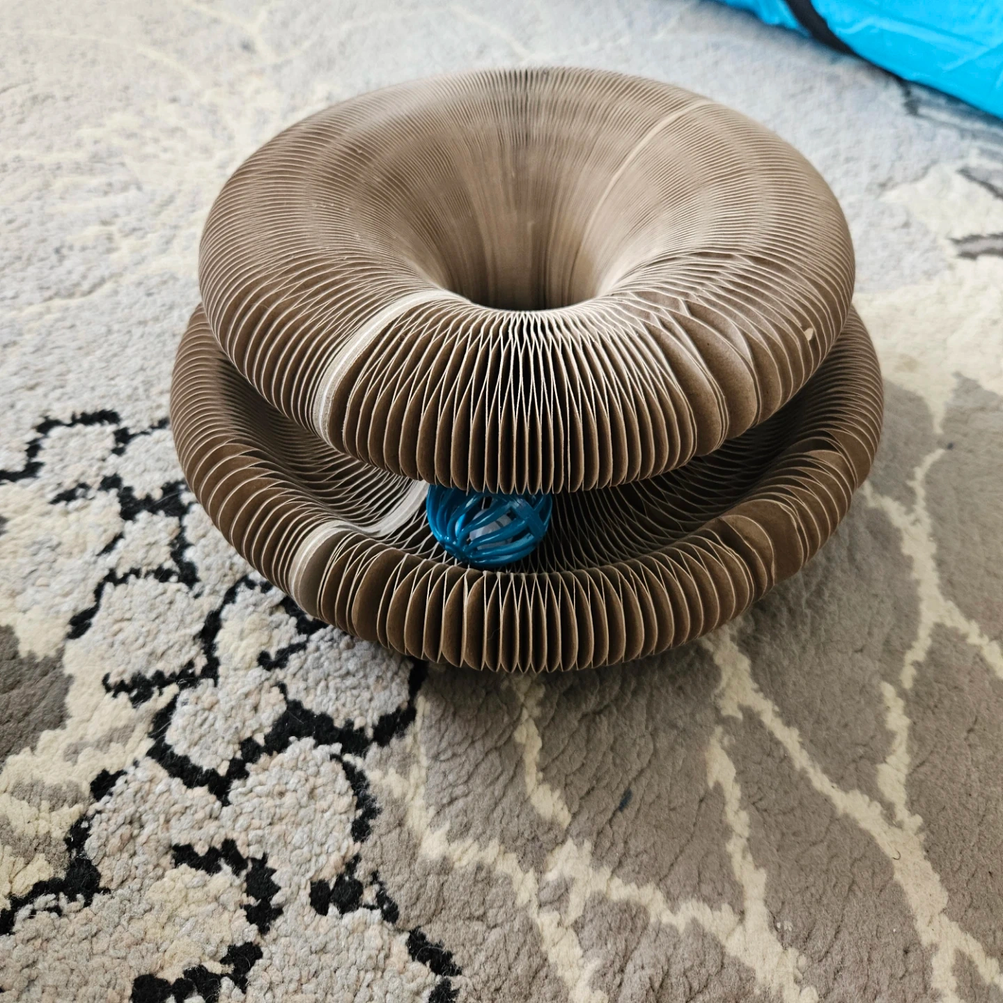 Selling a cat scratcher lounge bed! It's in great shape and comes with a ball for your kitty to play with. This scratcher is perfect for keeping your cat entertained and their claws healthy. It's a fun and functional addition to any cat lover's home!