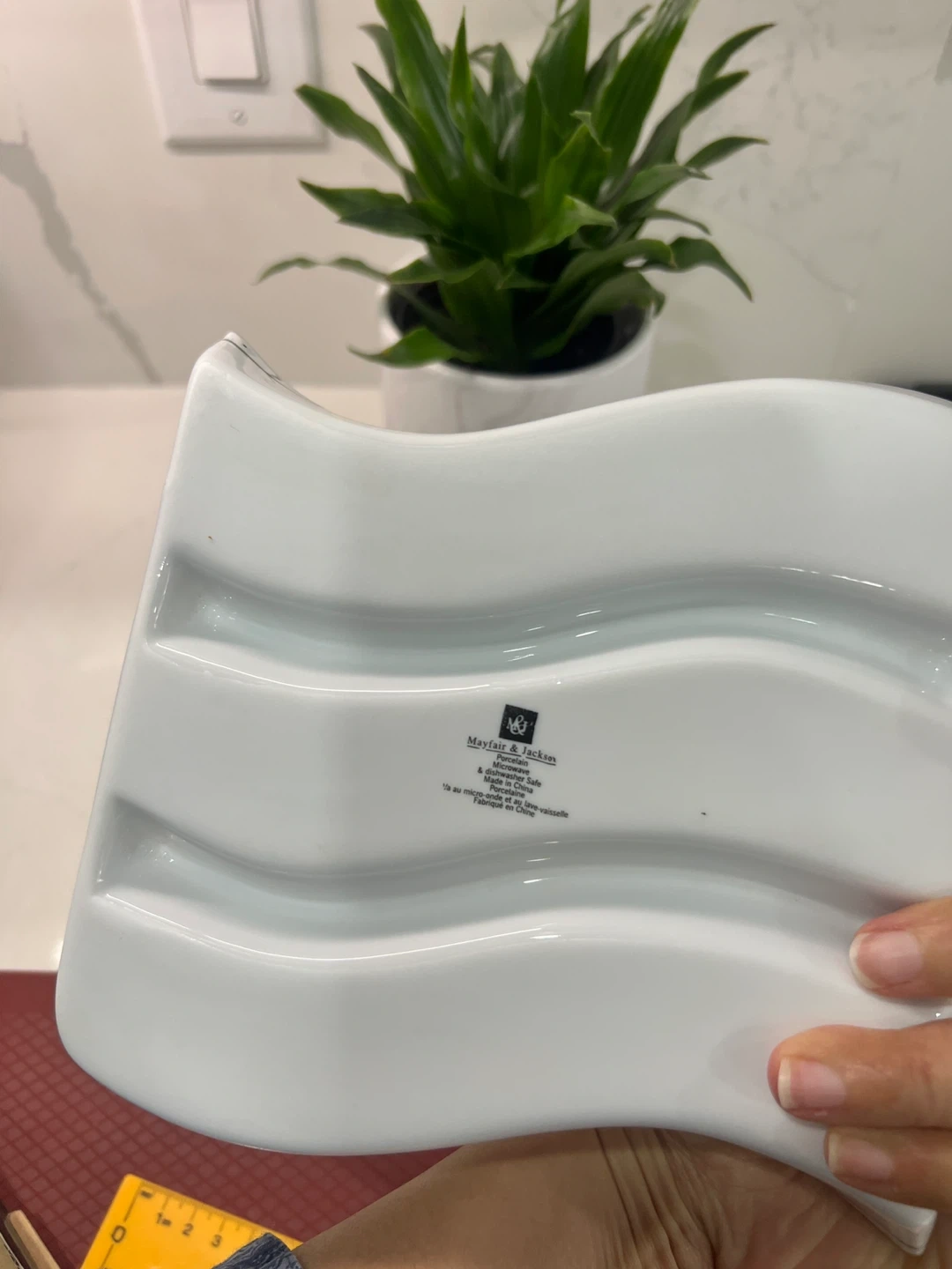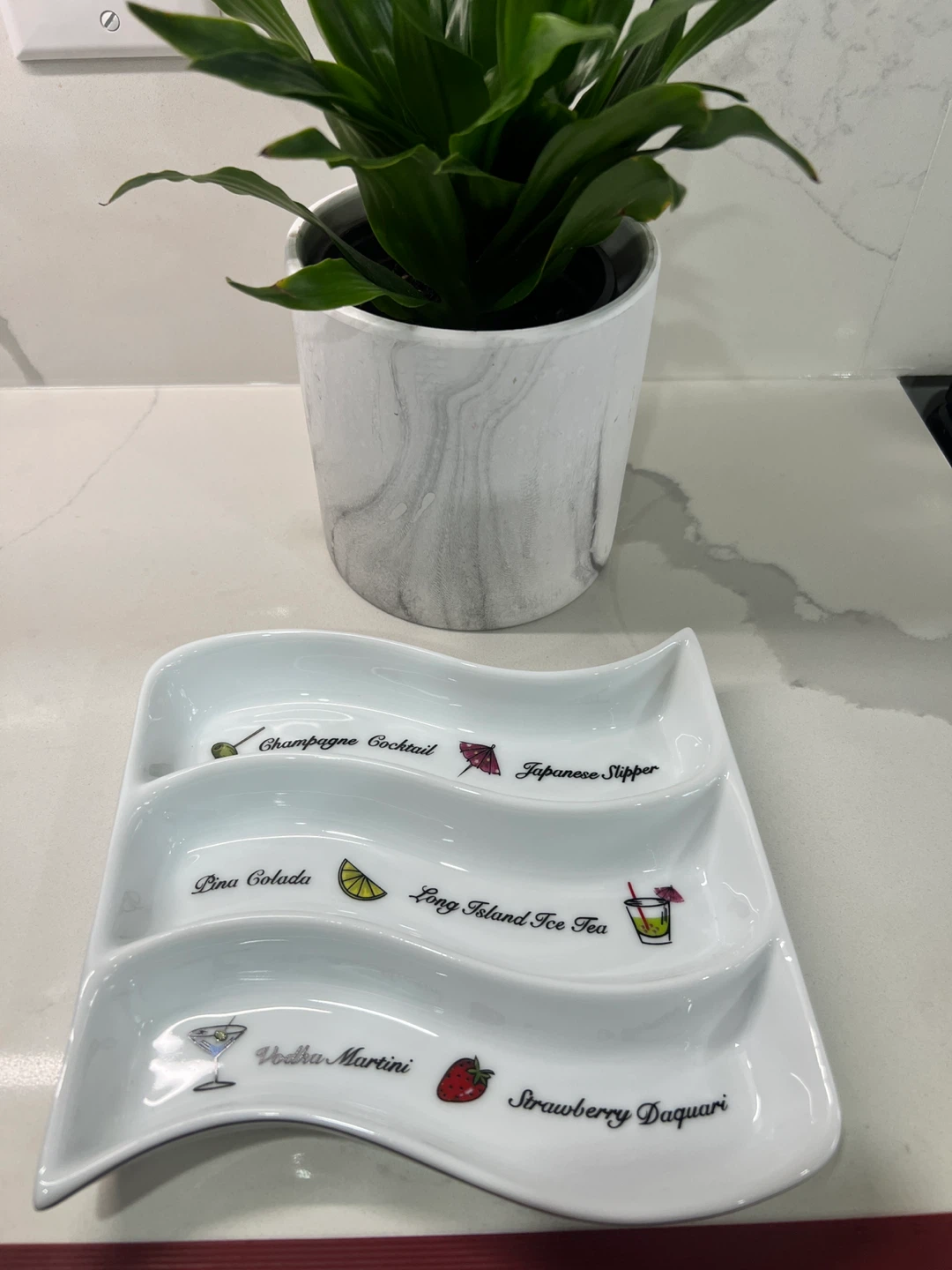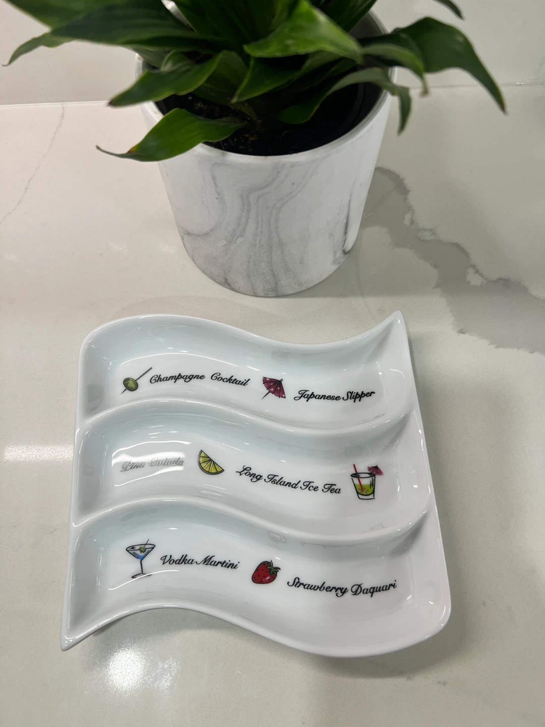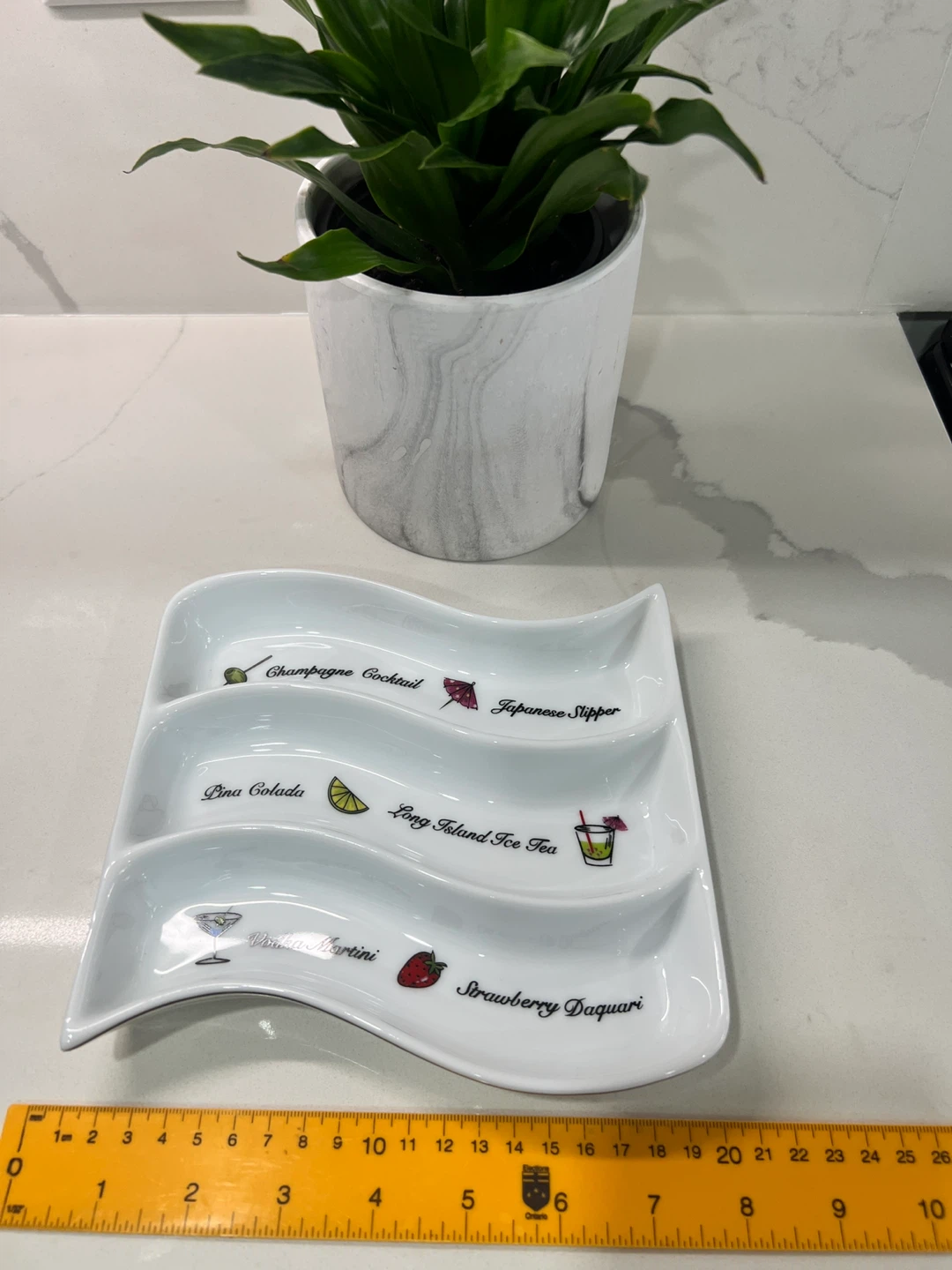 This is a lovely Mayfair & Jackson appetizer plate, perfect for serving cocktails and snacks! It features a wavy design with labeled sections for different cocktails like Champagne Cocktail, Pina Colada, and Strawberry Daquari. Great for entertaining!