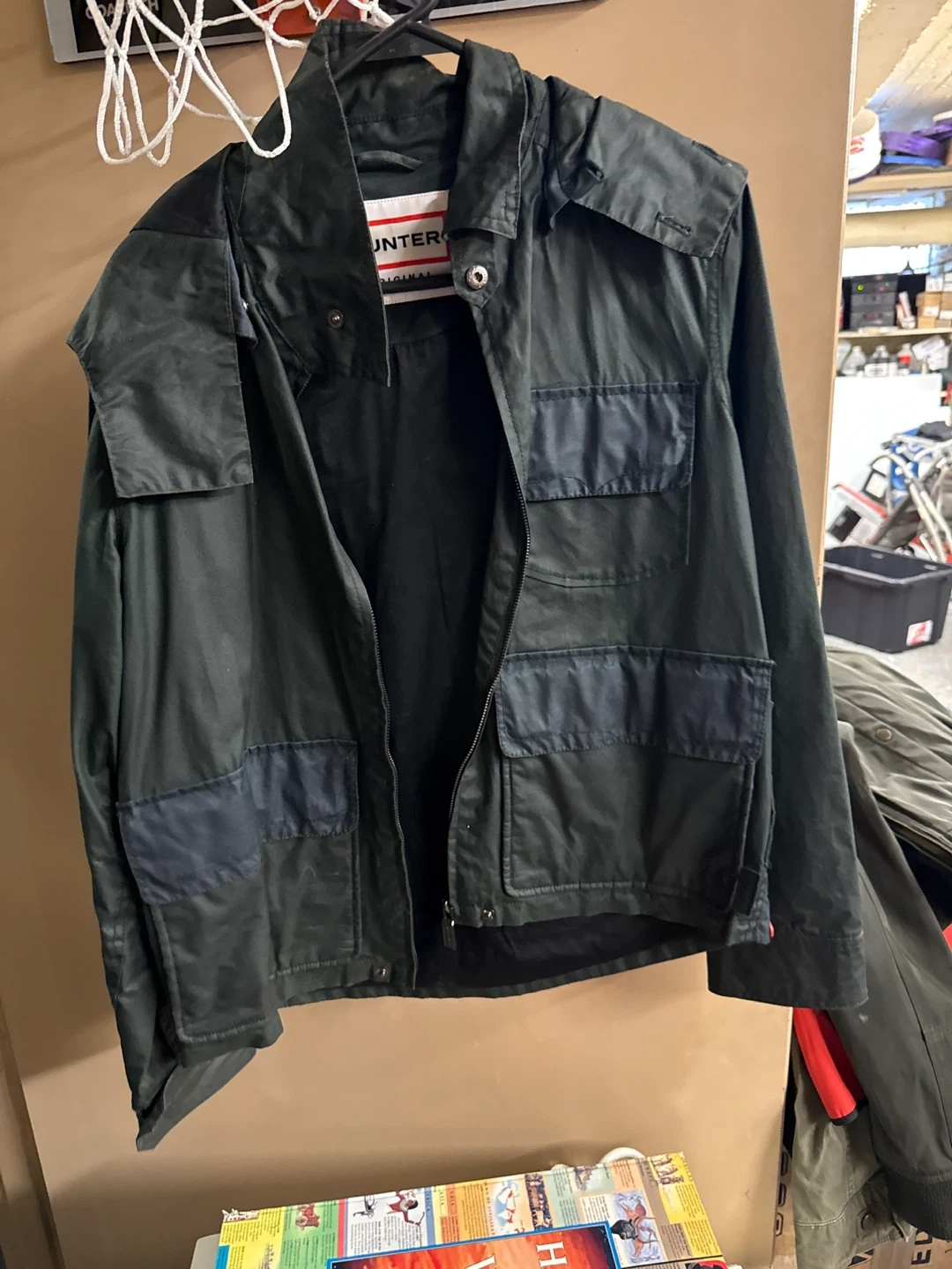 Selling a Hunter Original waxed hunting coat jacket. It's a stylish and functional jacket, perfect for outdoor activities or everyday wear. The waxed material provides water resistance, and the design includes multiple pockets for storage. It's in great condition and ready for a new owner!