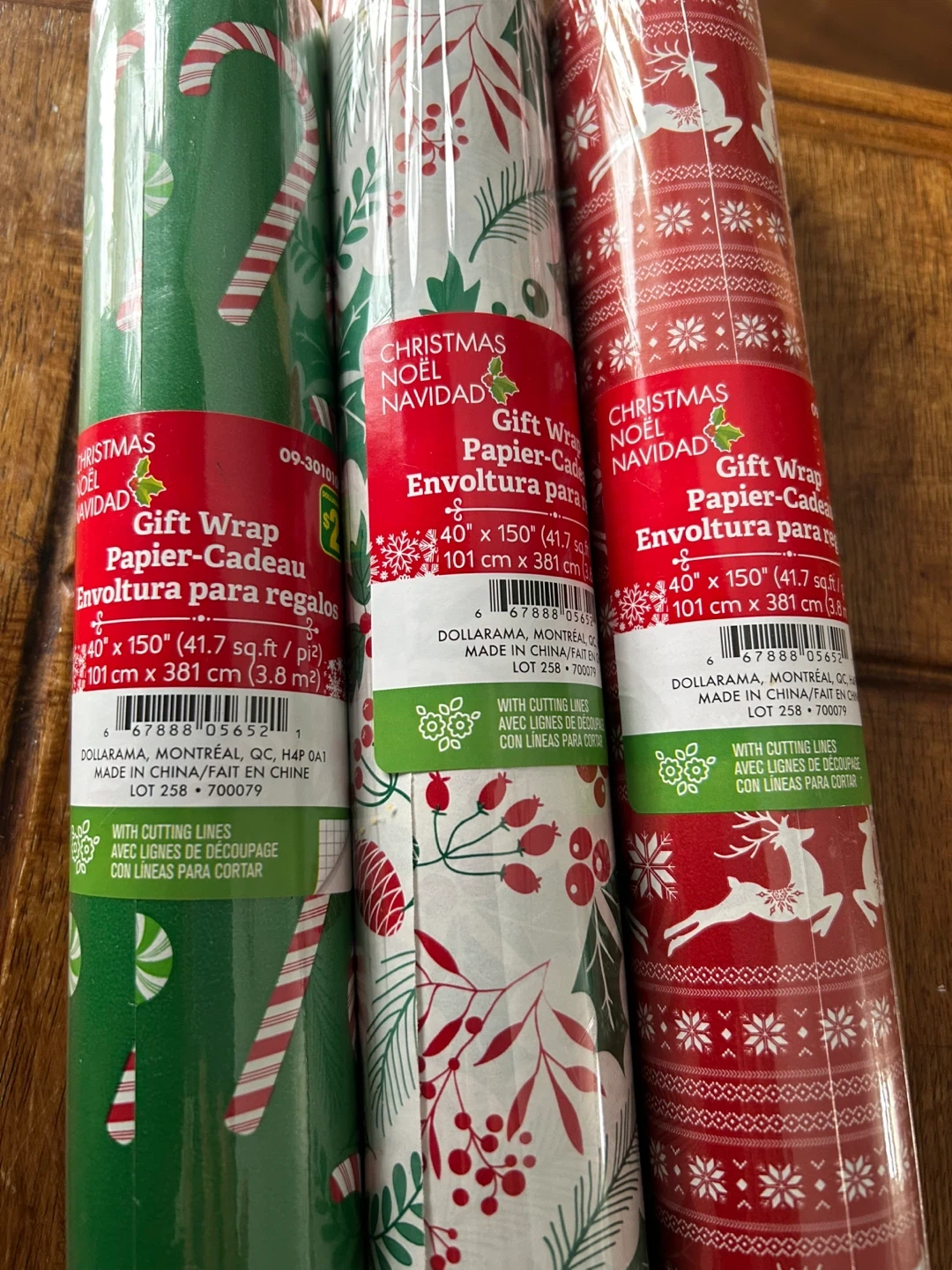 Selling three rolls of Christmas gift wrap from Dollarama! Each roll is 40" x 150" (101 cm x 381 cm) and features cutting lines for easy wrapping. Perfect for all your holiday presents!