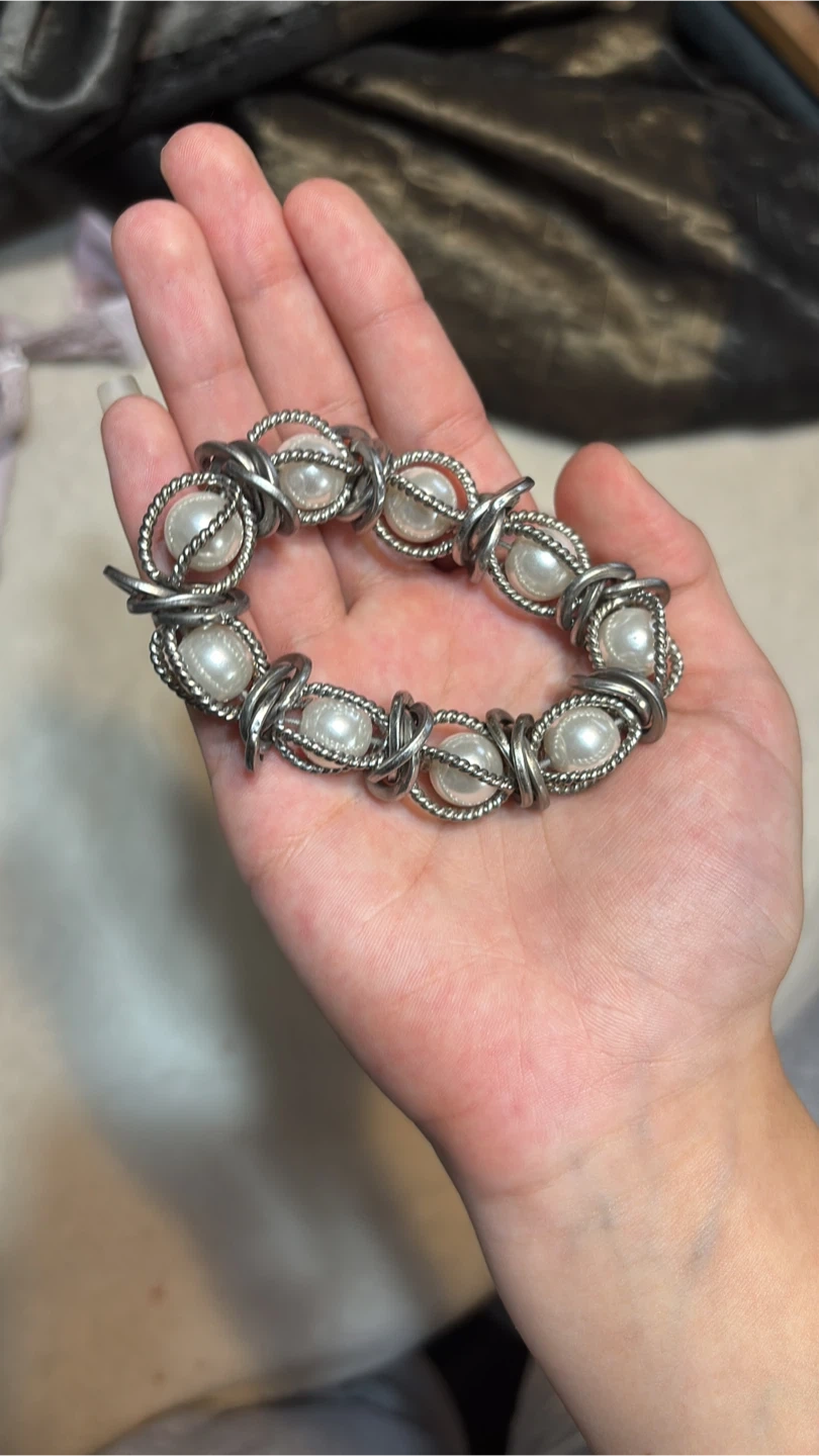 Selling a silver-tone bracelet with faux pearl accents! It's in great condition and would be a lovely addition to your jewellery collection
