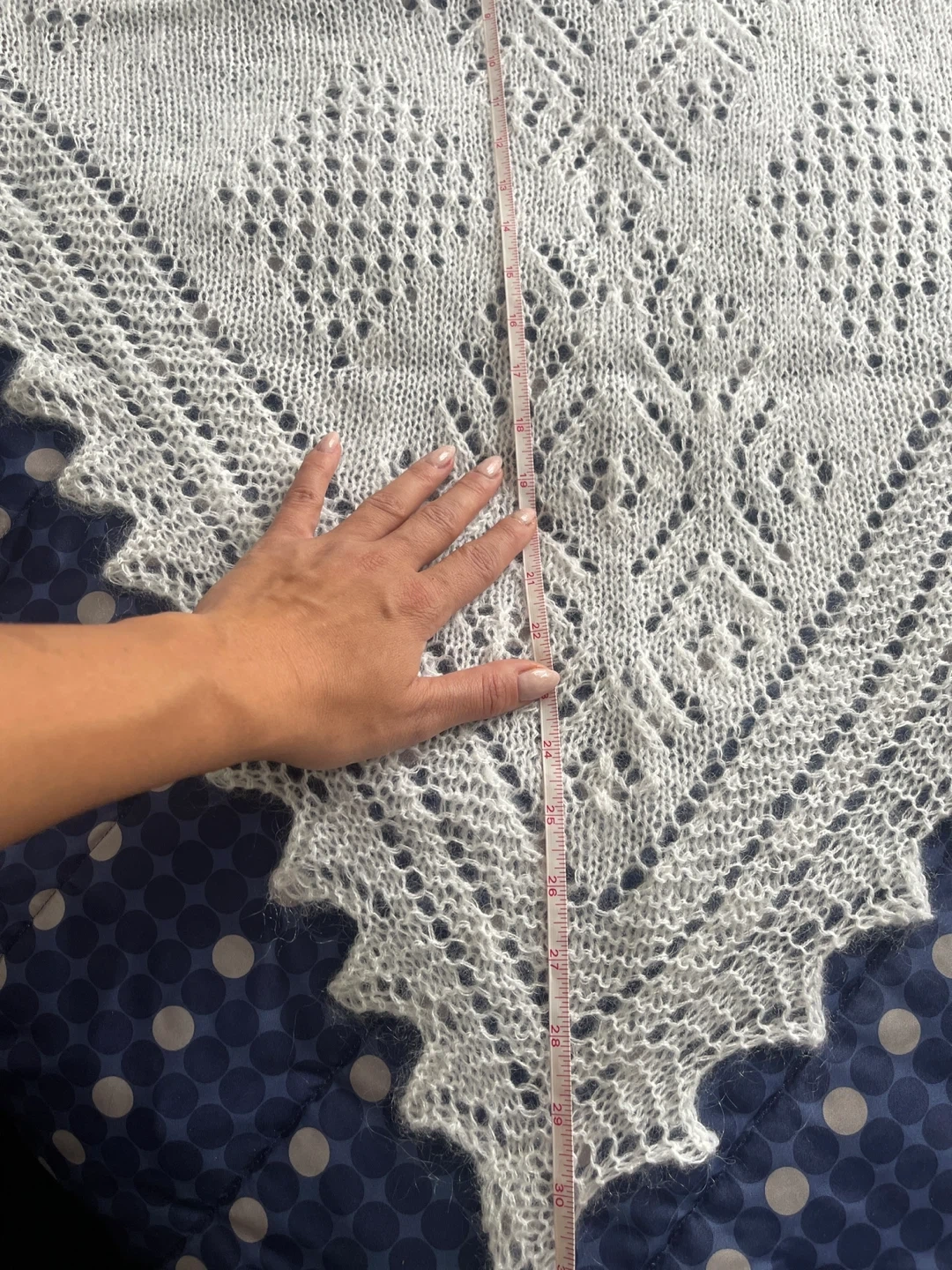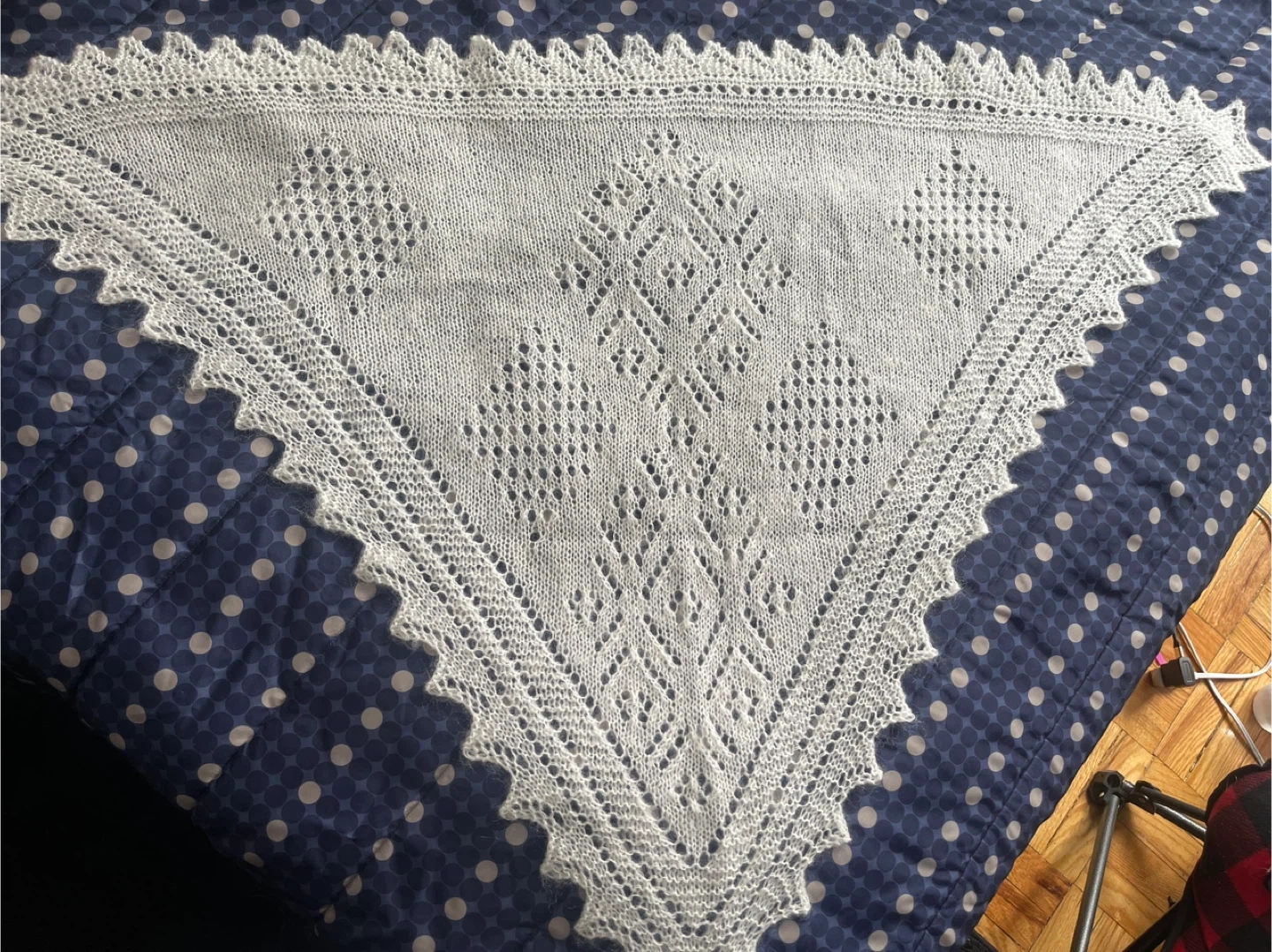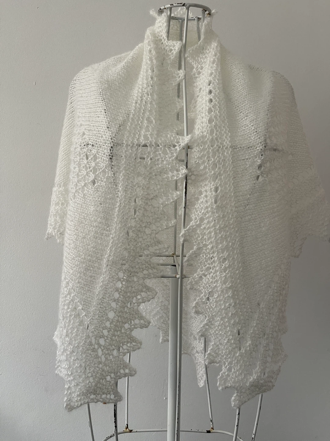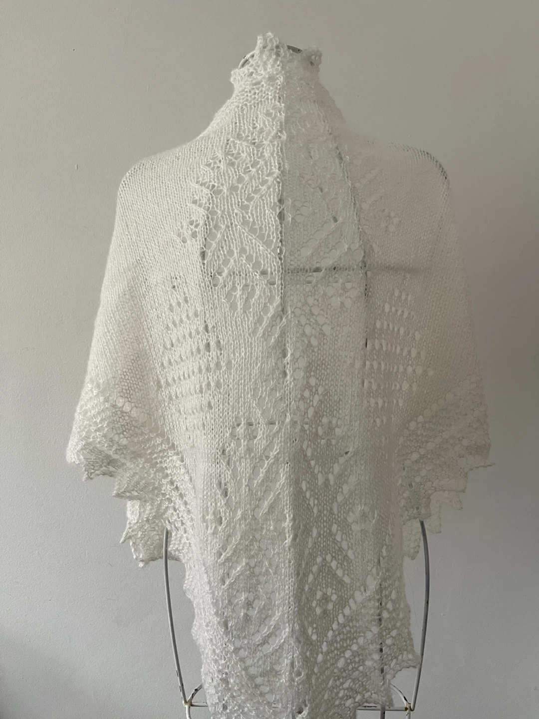 Selling a beautiful, hand-knitted white shawl. It features a delicate, intricate pattern and is approximately 48 inches long. Perfect for adding a touch of elegance to any outfit!