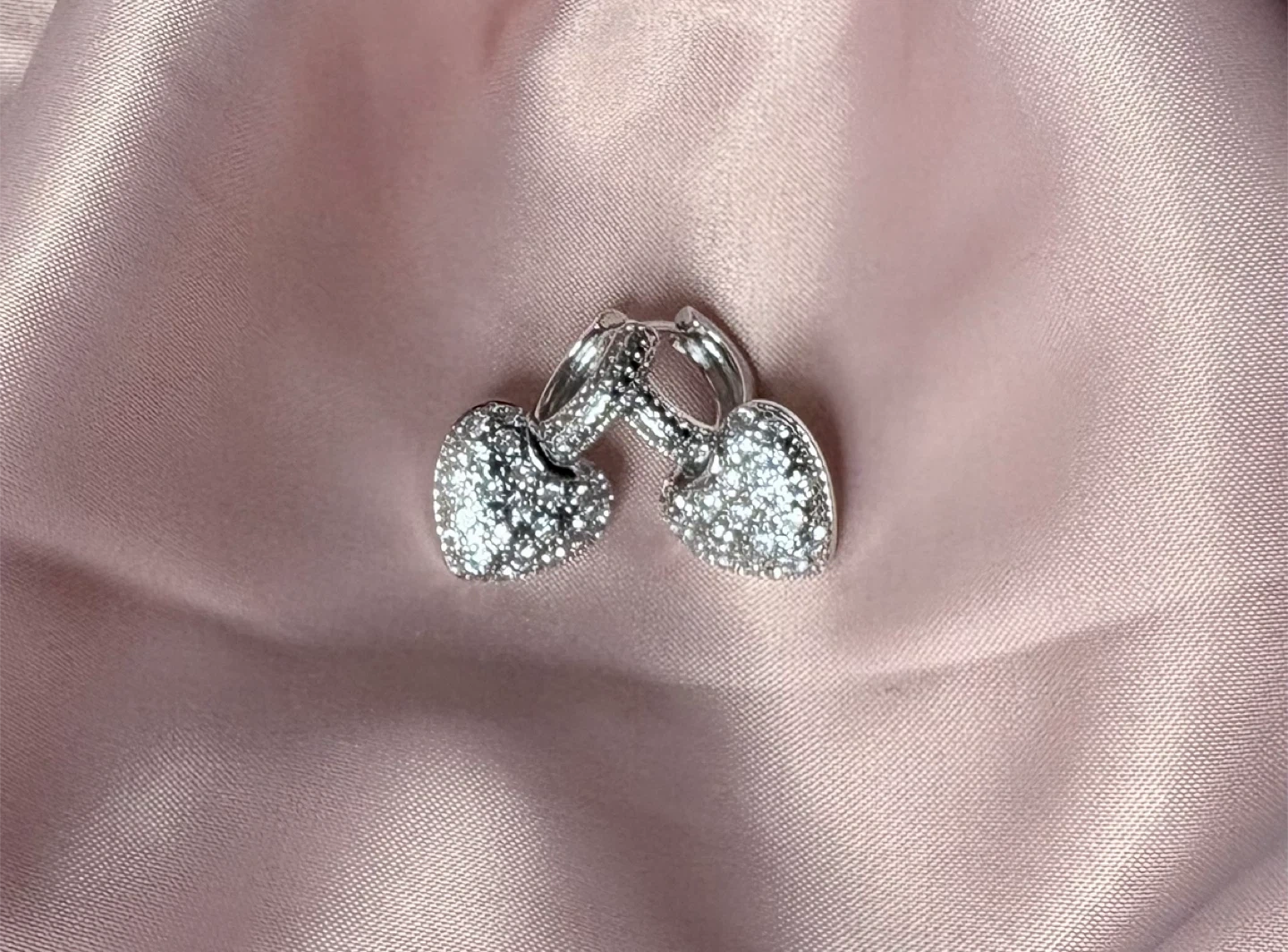 They feature a pave setting with small, sparkling stones on the front of the heart. The earrings have a hinged closure for easy wear.