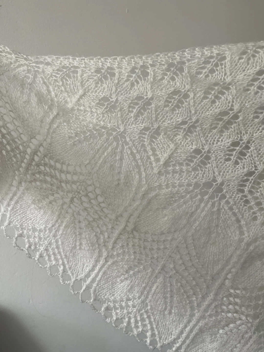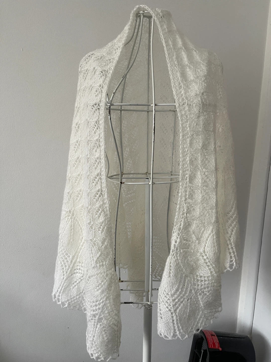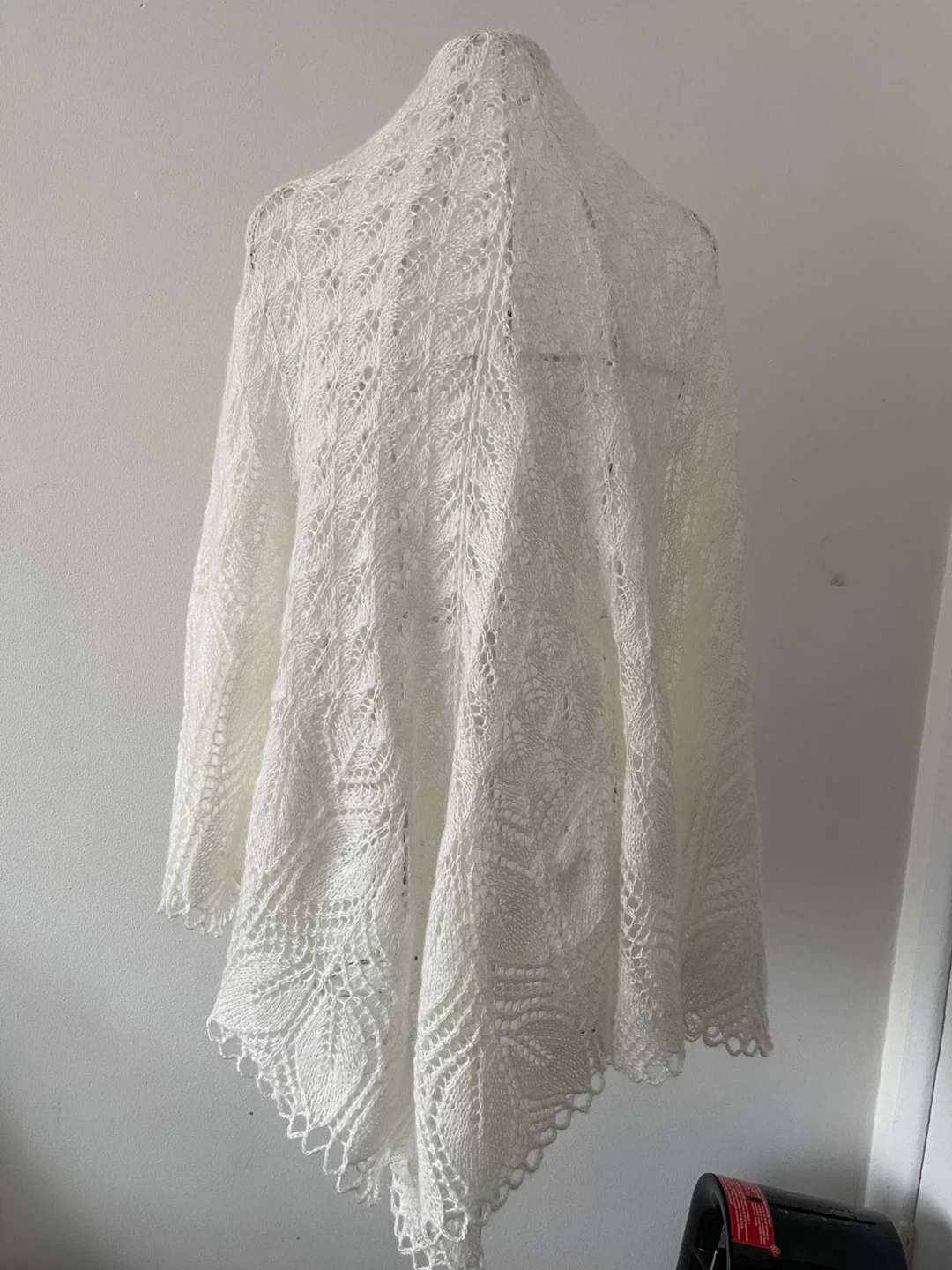 Selling a beautiful white lace shawl. It's in great condition and would be perfect for adding a touch of elegance to any outfit. The delicate lace pattern is really lovely!