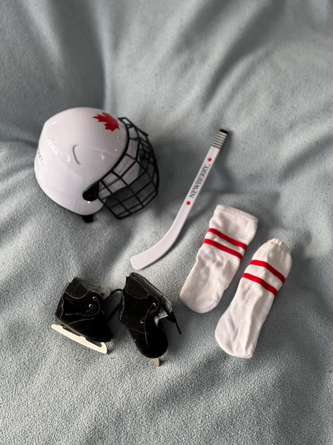 Here's an adorable Newberry doll hockey set! It includes a helmet with a Canadian flag, skates, a hockey stick, and socks. Perfect for your little one's doll to enjoy some Canadian winter fun