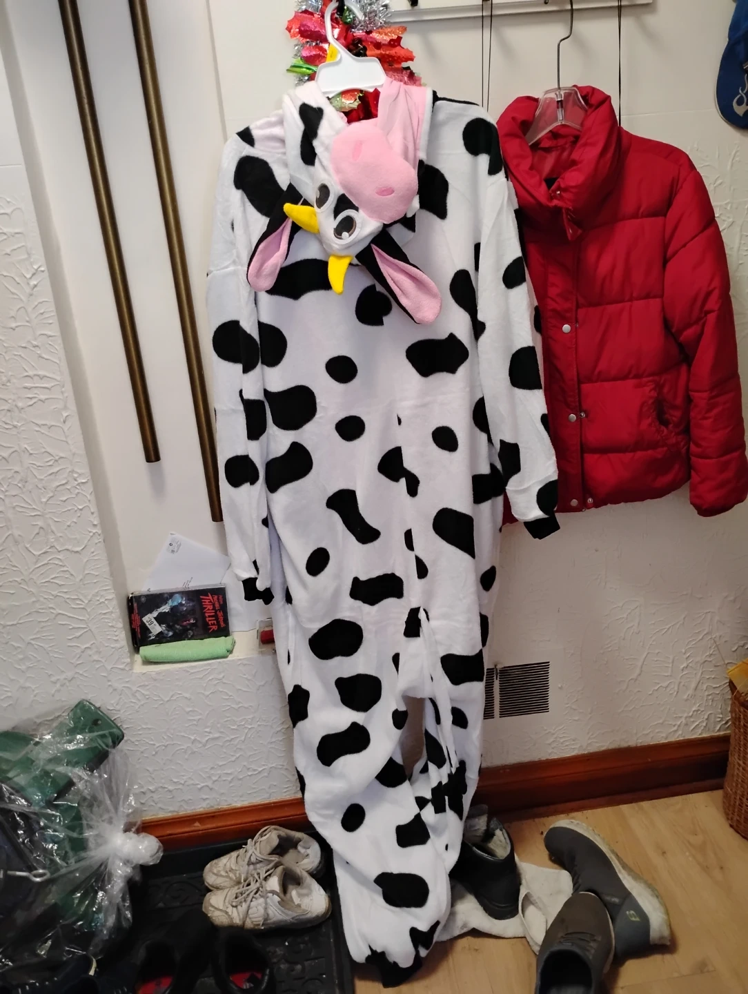 Snuggle up in this super cute Spooktacular Creations adult unisex cow hooded jumpsuit! It's an XL and made of 100% polyester. The production date is April 2025.