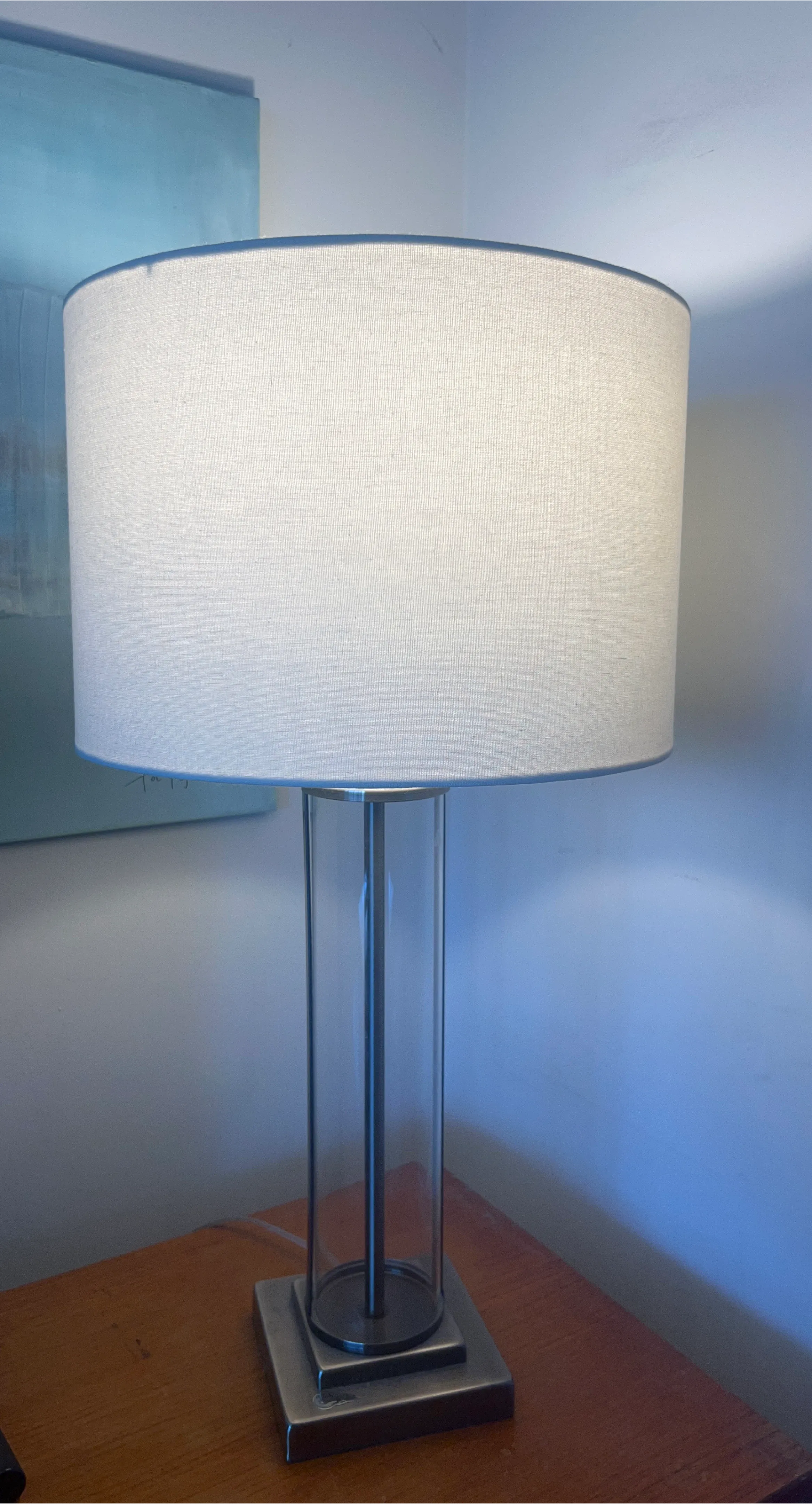 Selling a stylish table lamp with a cylinder glass base! It's in great shape and would look lovely in any room. The lampshade is a neutral colour, and the base has a modern design.