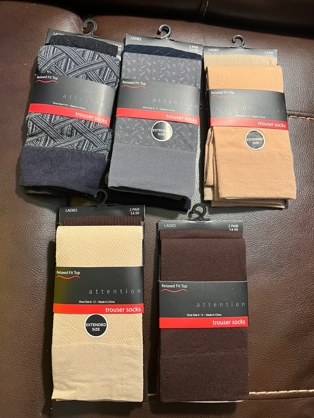 I have multiple packs of Attention ladies' trouser socks for sale! They are relaxed fit and designed for shoe sizes 6-12. Each pack contains two pairs, and they retail for $4.99. Perfect for everyday wear!