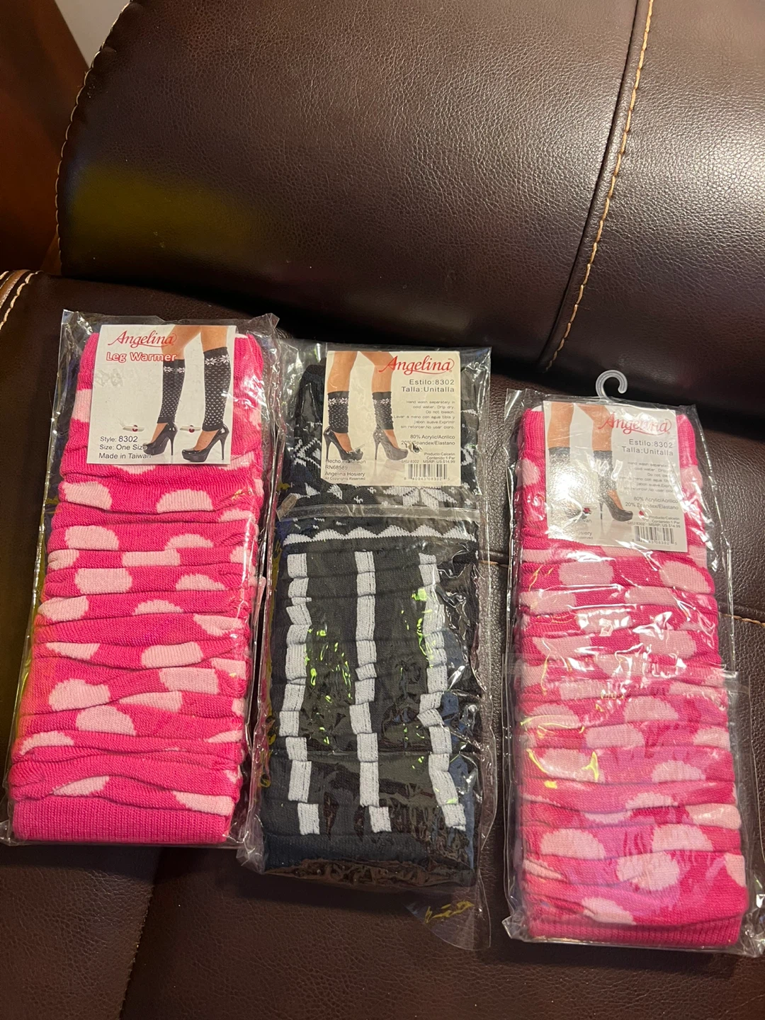 I have three pairs of brand new Angelina leg warmers for sale! They are still in their original packaging. The available colours are pink with white polka dots and black with white stripes. They are one size fits all and made of 80% acrylic