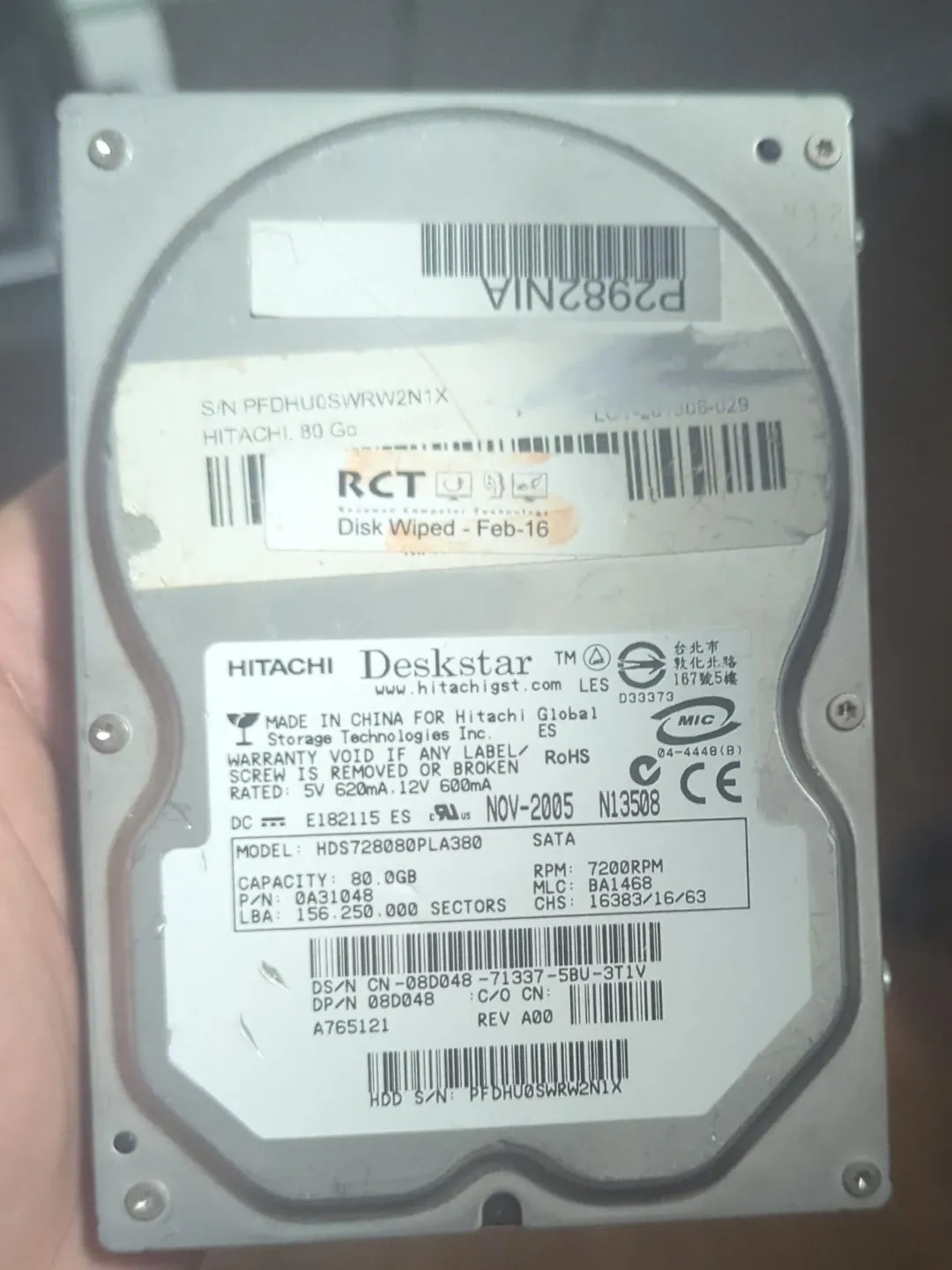 Selling a Hitachi Deskstar hard drive with 80GB capacity. Model number is HDS728080PLA380. It has a SATA interface and spins at 7200RPM. Disk was wiped Feb-16