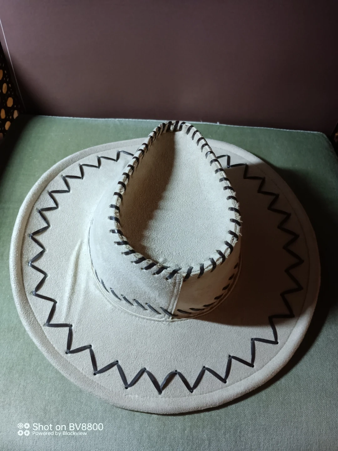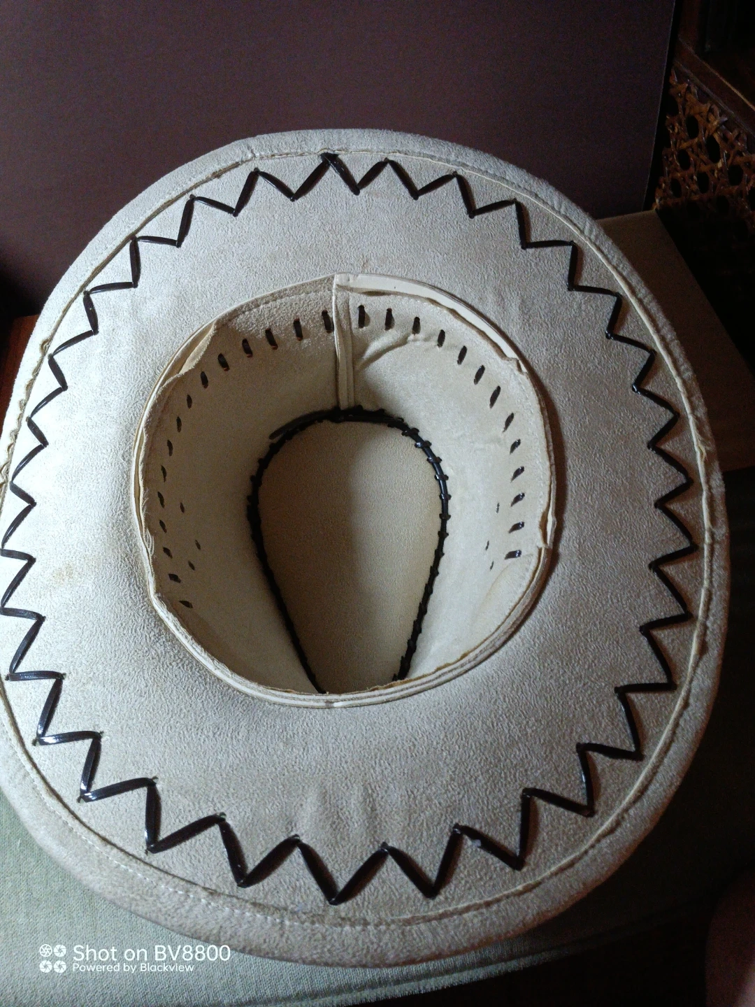 Selling an off-white cowboy hat. It has a decorative zig-zag pattern around the brim and crown. It's in great condition and ready for your next rodeo or costume party!