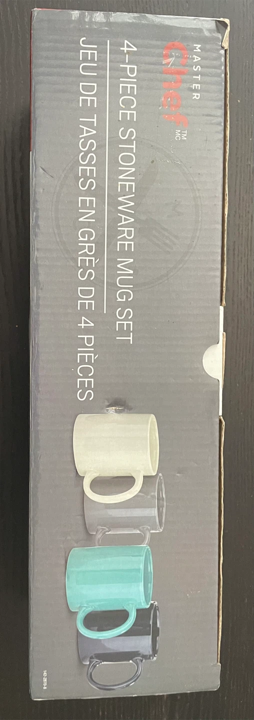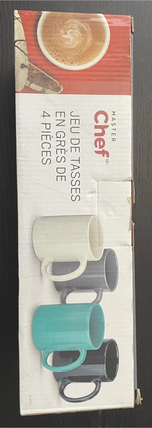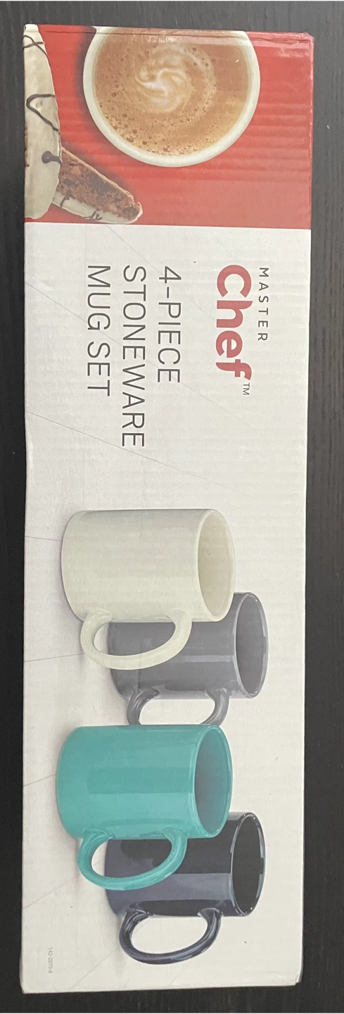 Selling a brand new Master Chef 4-piece stoneware mug set! The set includes mugs in white, grey, teal, and black. Perfect for your morning coffee or tea!