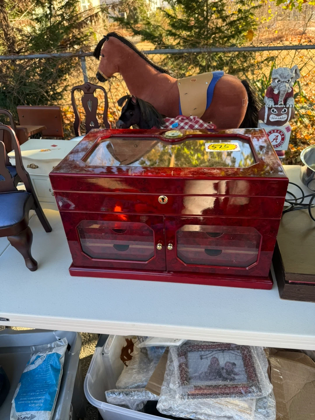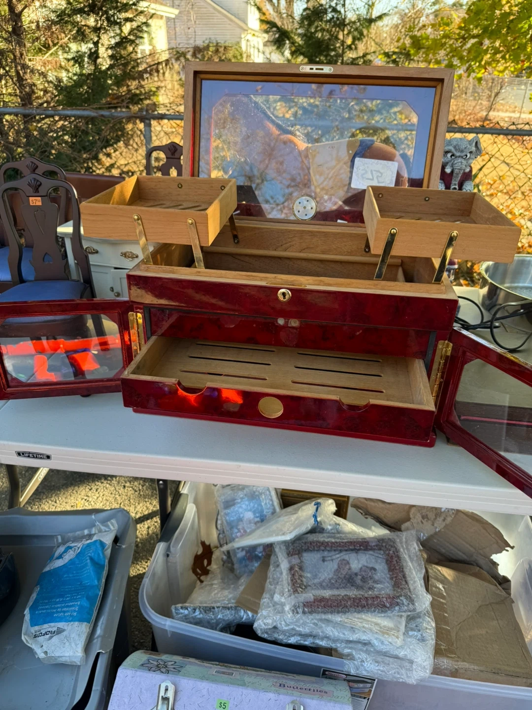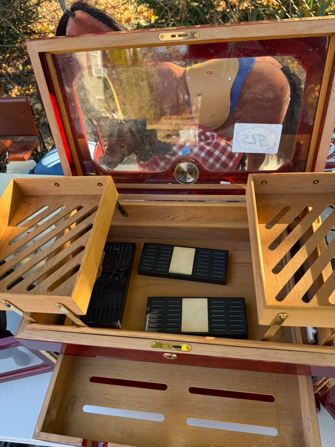 Selling a red wooden humidor. It has multiple drawers and compartments for storing cigars. Would be a great addition to any collection