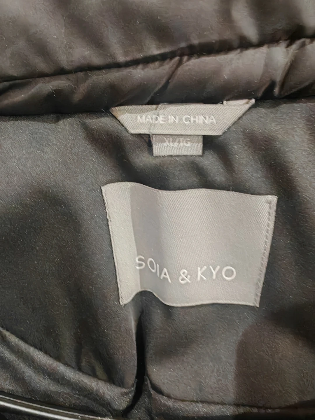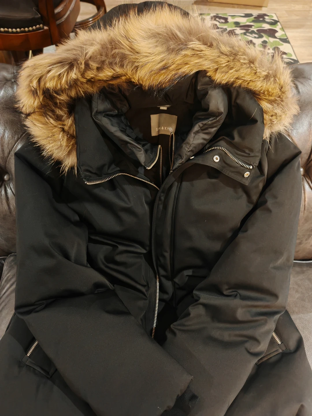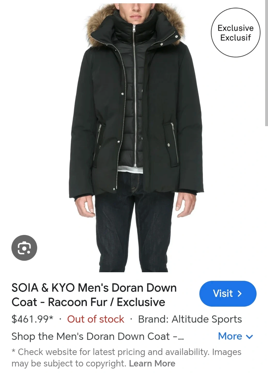 Selling a Brand New With Tag Soia & Kyo Doran down coat in black, Men size XL. It features a raccoon fur trim. The original price was $461.99 + HST