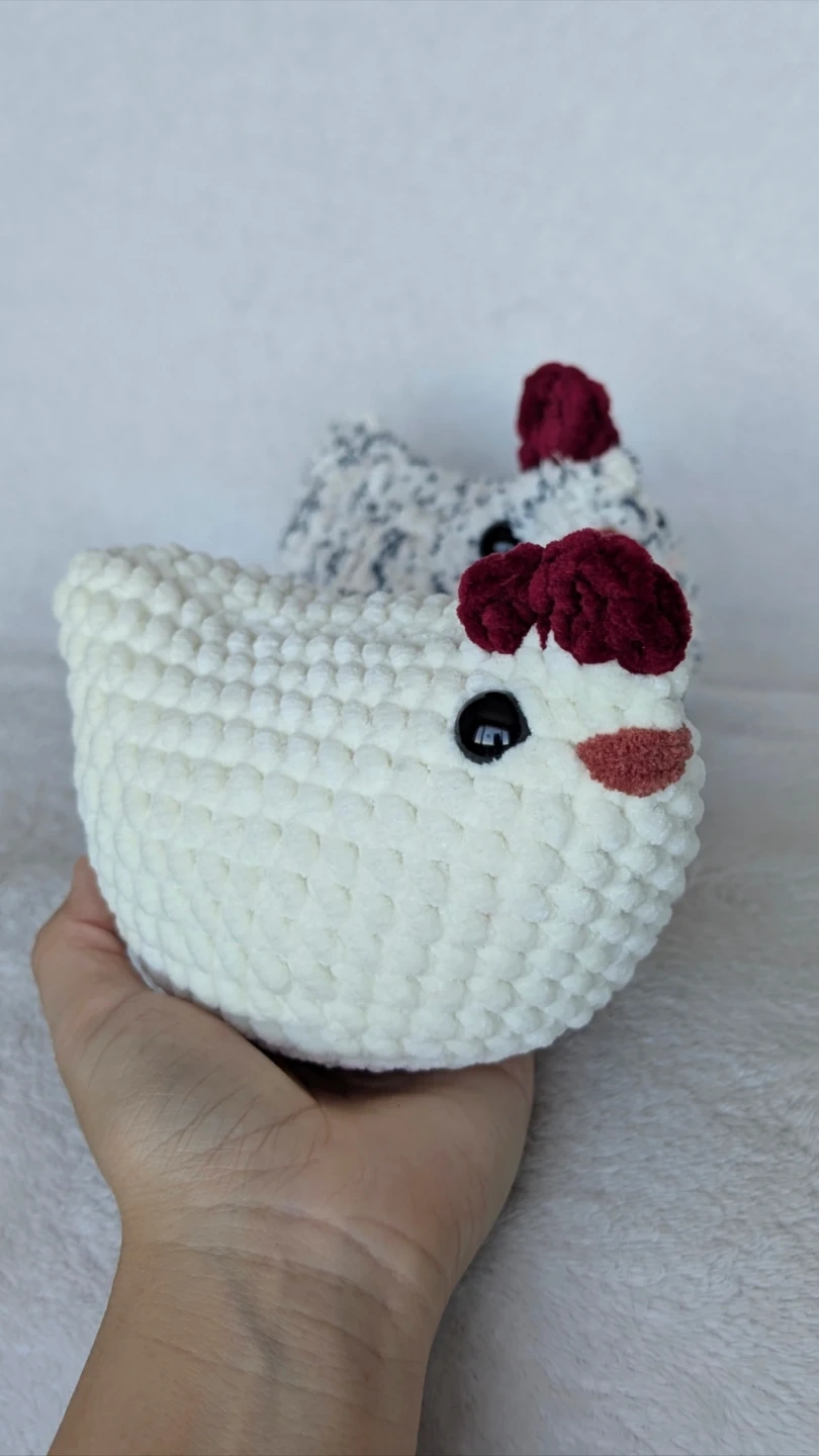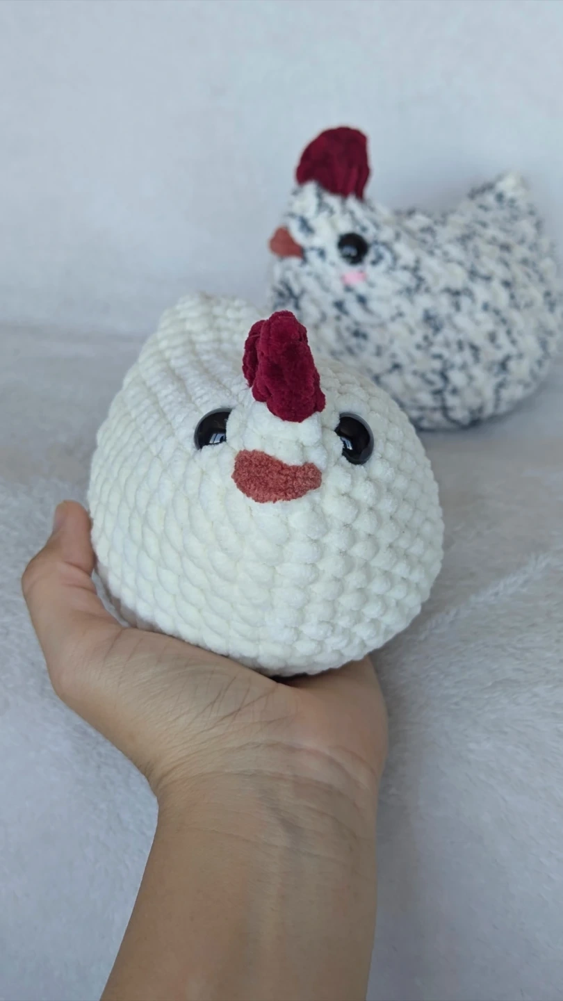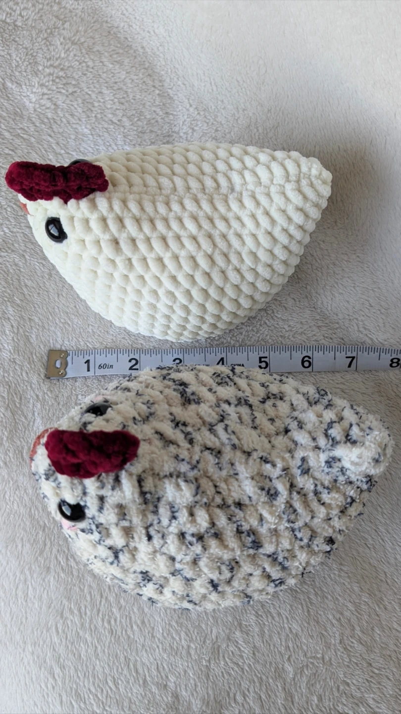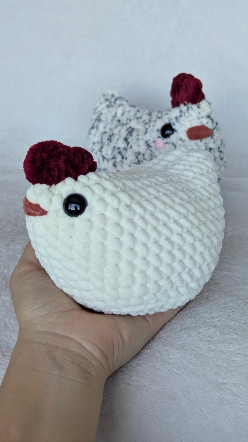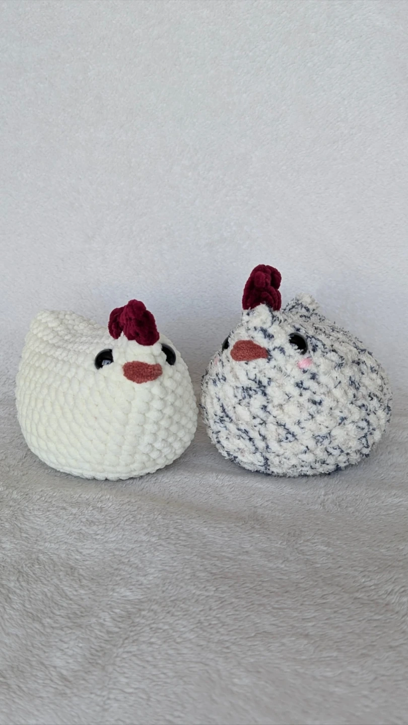 Selling these adorable crocheted chicken plush toys! They are handmade with love and would make a cute addition to any room. One is white and the other is a speckled grey colour. They are about 6 inches long.