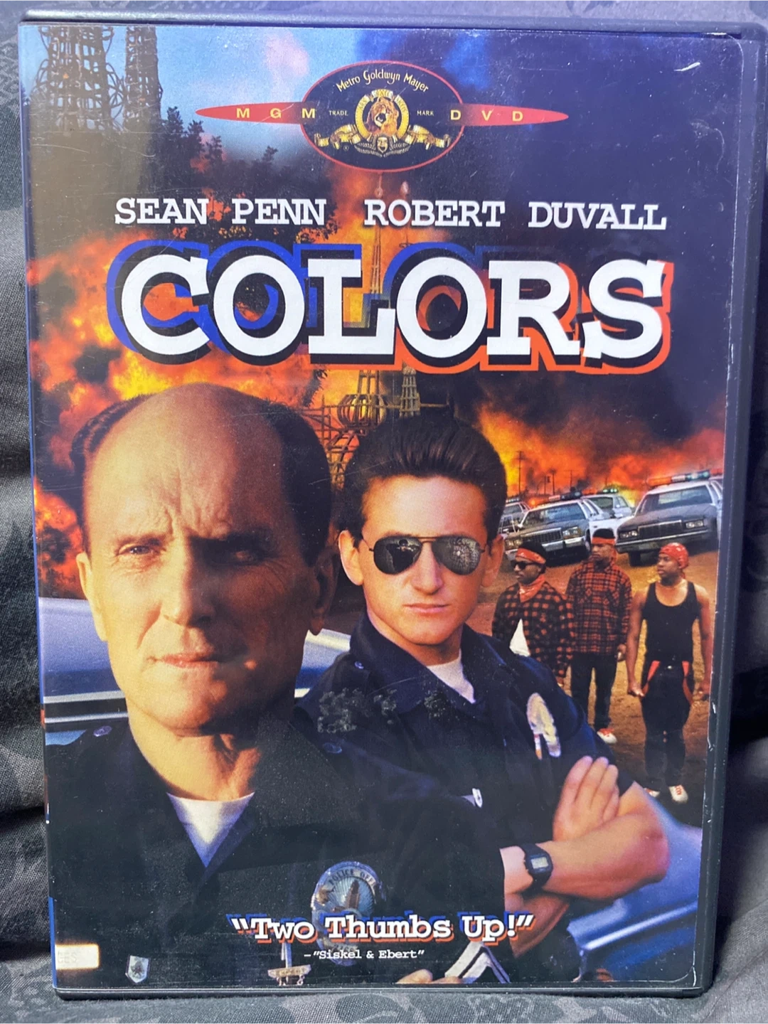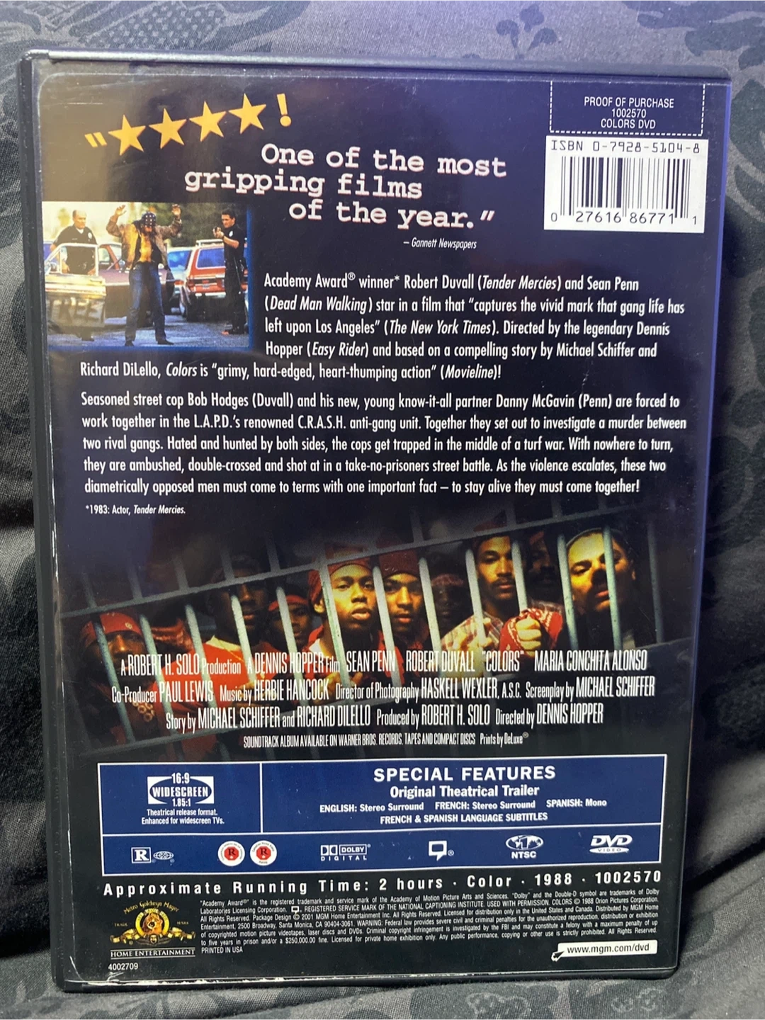 Selling the DVD of the movie 'Colors' starring Sean Penn and Robert Duvall. It's a gripping film about seasoned street cops in L.A. fighting against anti-gang units. The DVD includes special features like the original theatrical trailer and French and Spanish language subtitles. Approximate running time is 2 hours. A must-watch!