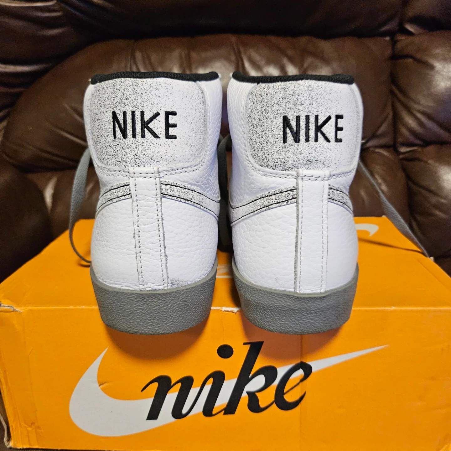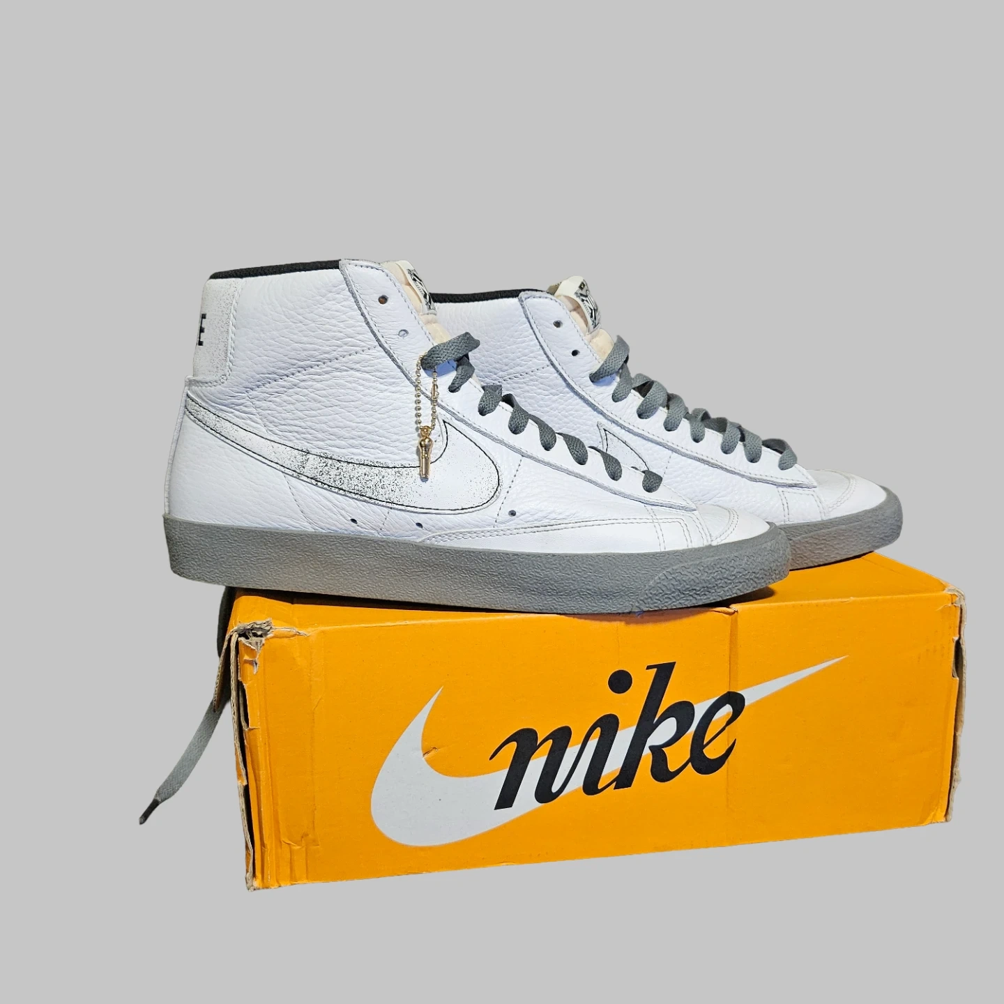 Selling a pair of new Nike Blazer Mid '77 Premium sneakers in white. Celebrating "50 Years of Hip-Hop" sneaker in white tumbled leather with smoke grey accents. Come with a golden microphone charm.