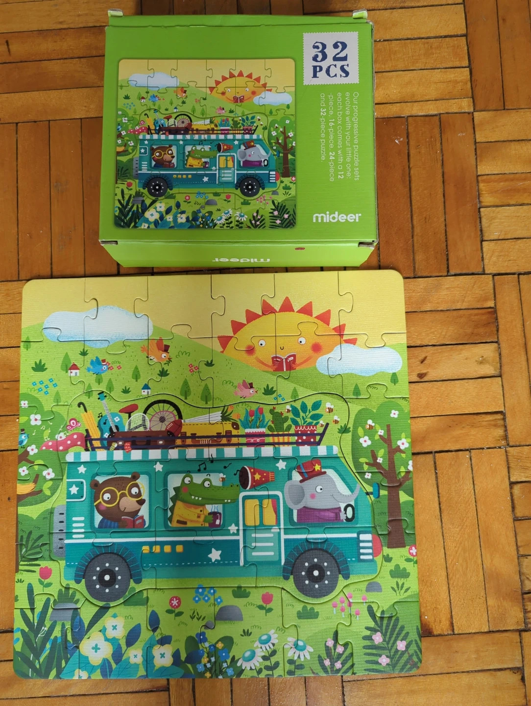 Selling a brand new Mideer puzzle! It comes with 32 pieces and the box is included. The puzzle features a cute bus design with animal characters. Perfect for little ones!
