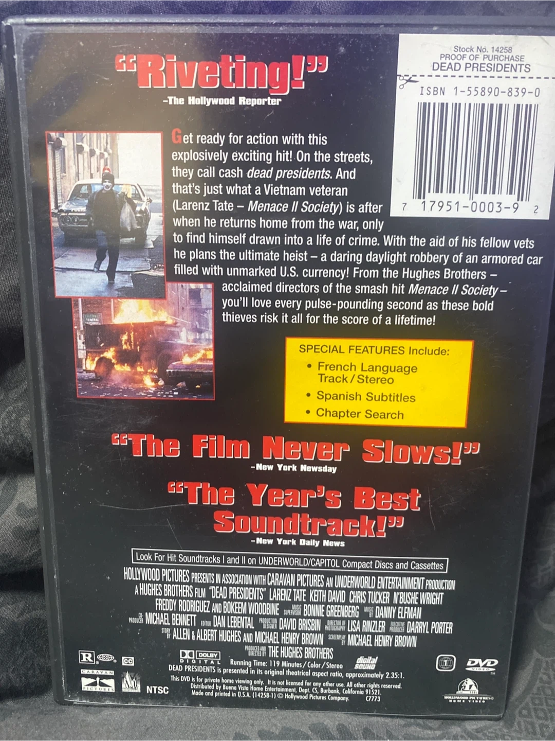 Selling the DVD of "Dead Presidents", a Hughes Brothers film! It's a digitally mastered, wide screen edition. The DVD includes special features like French language track/stereo, Spanish subtitles, and chapter search