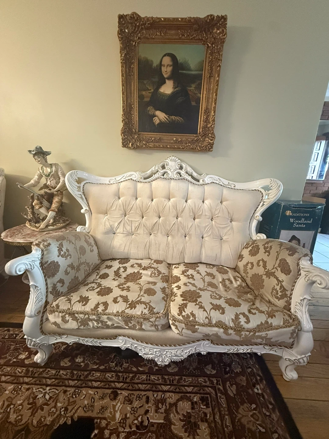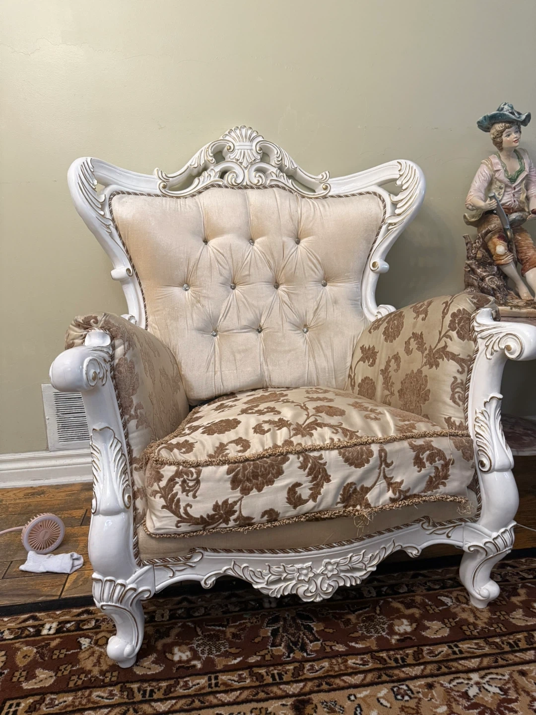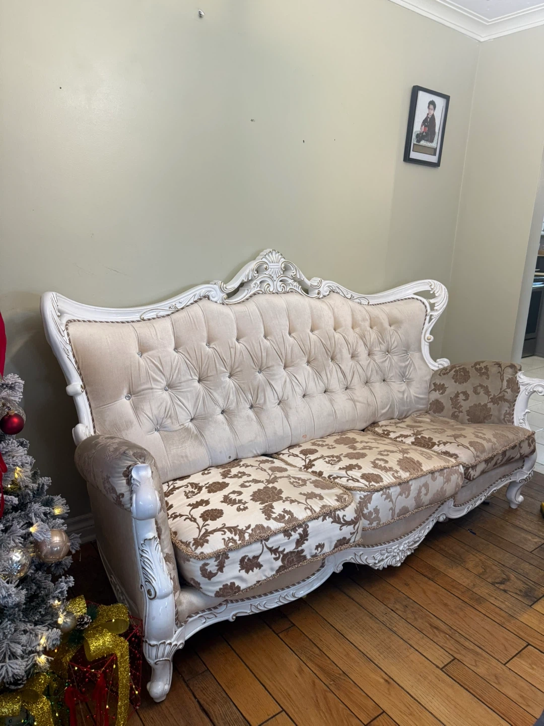 Selling a beautiful vintage-style sofa and armchair set! The set features ornate white detailing and patterned cushions. Perfect for adding a touch of elegance to any living space. It's in great condition and ready for a new home!