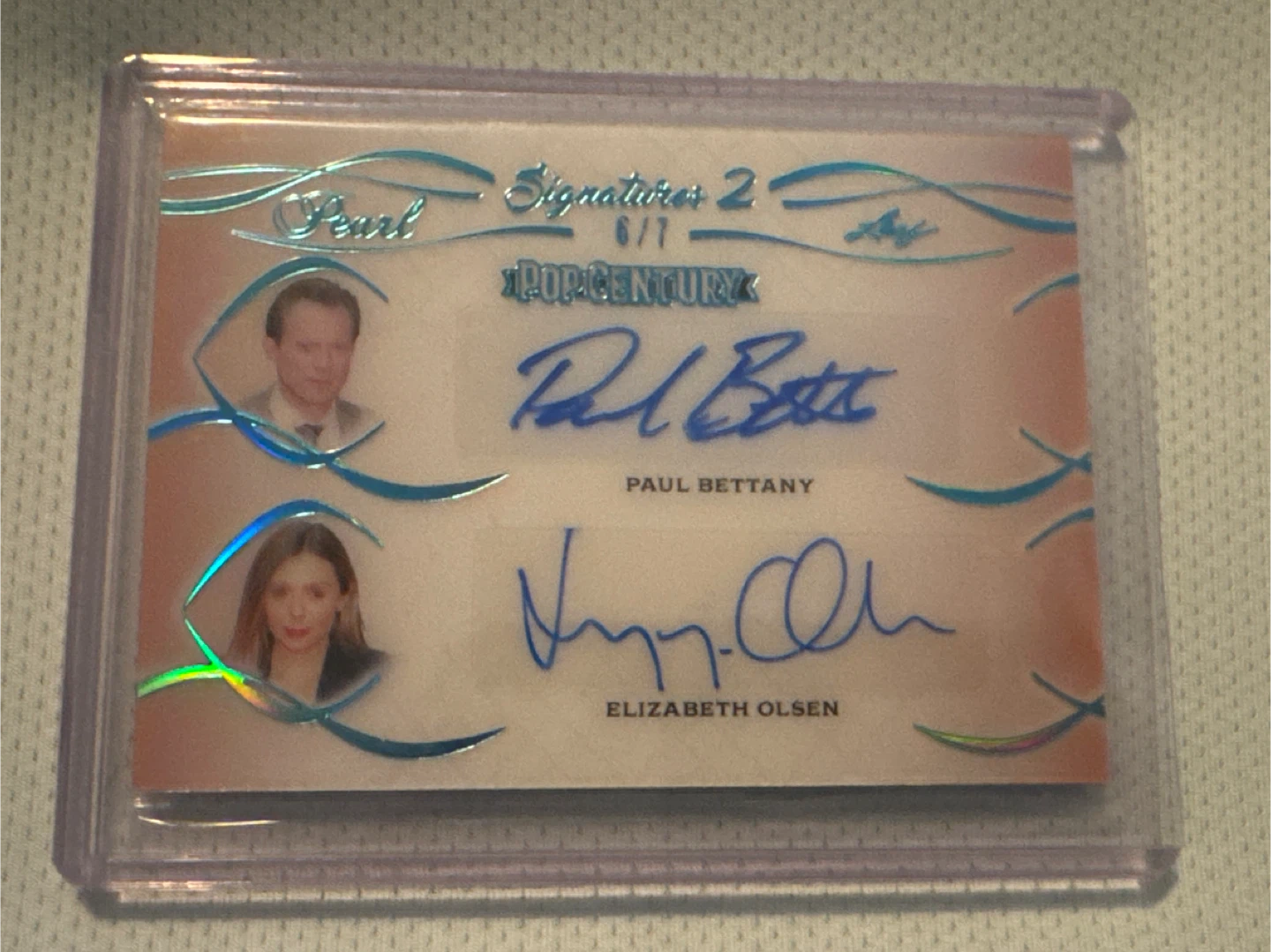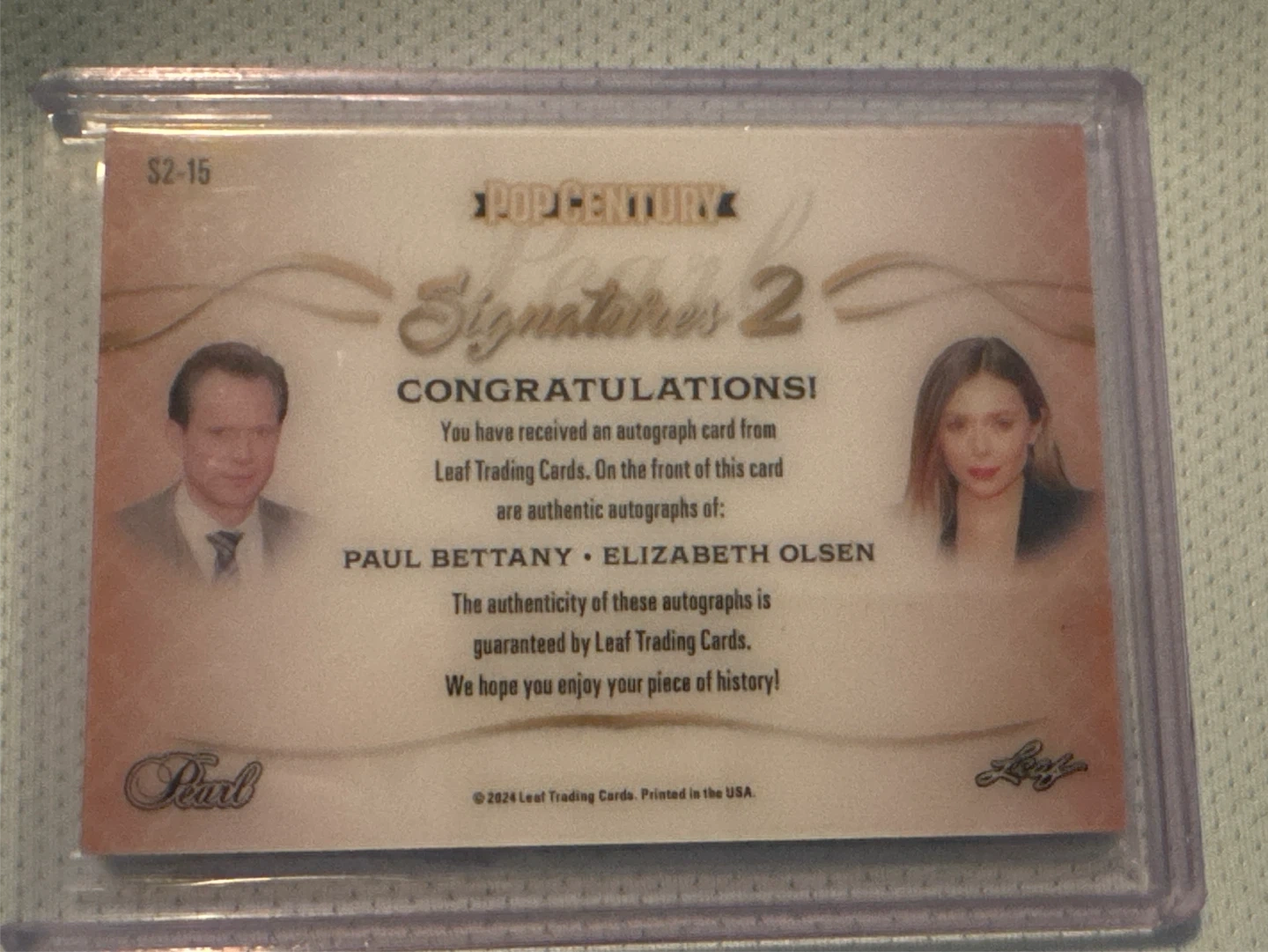 Selling a Leaf Trading Card featuring authentic autographs of Paul Bettany and Elizabeth Olsen! This Pop Century Signatures 2 card is a unique piece of history, guaranteed by Leaf Trading Cards. A great addition for any collector!