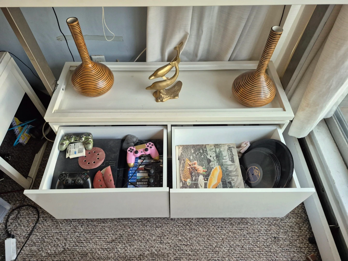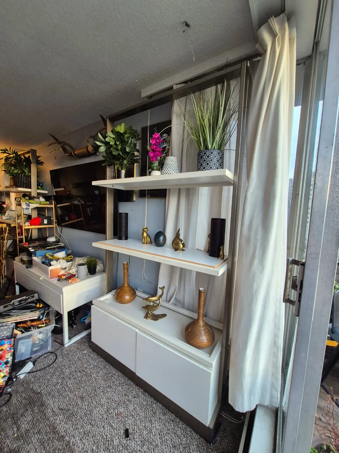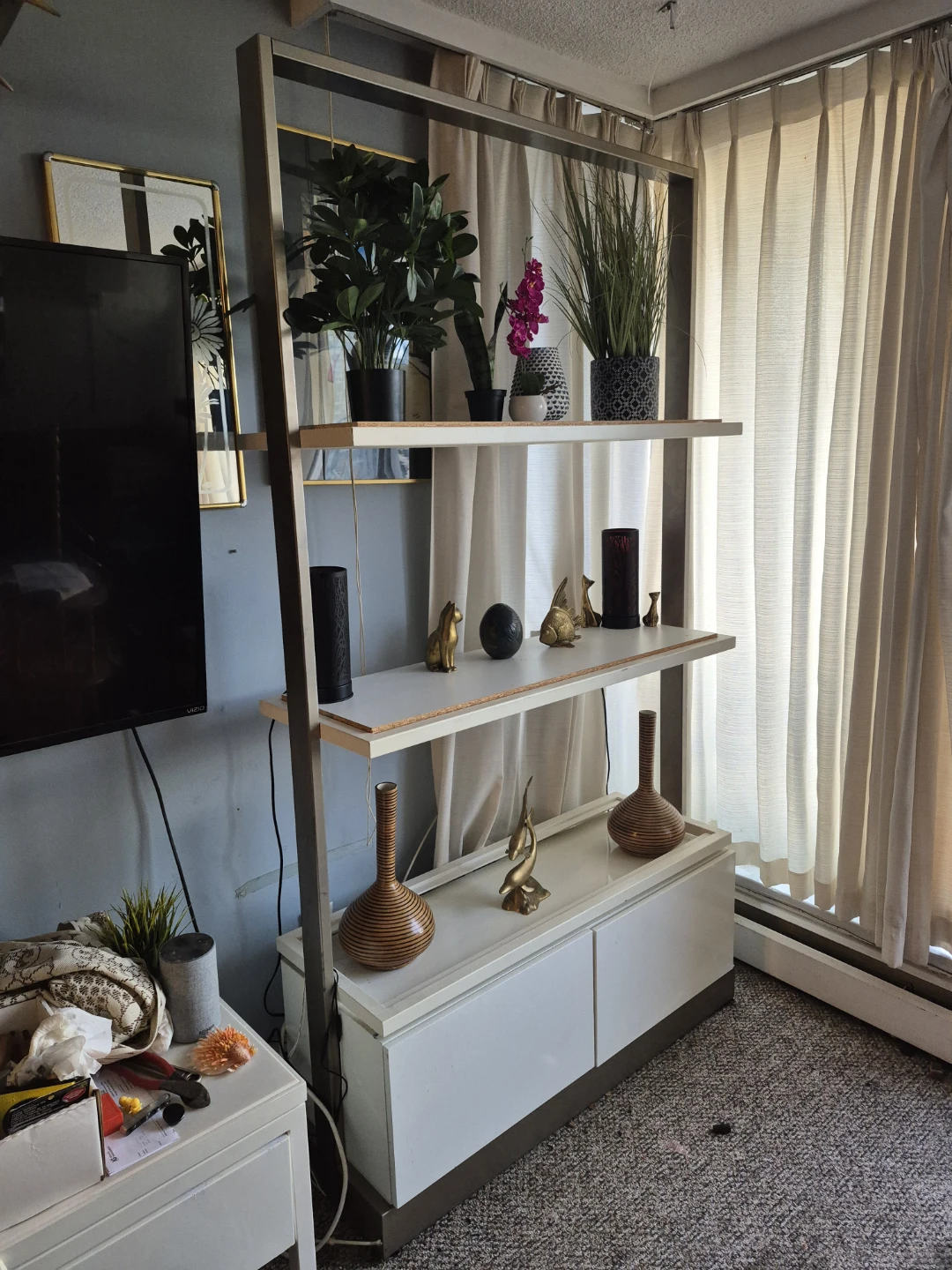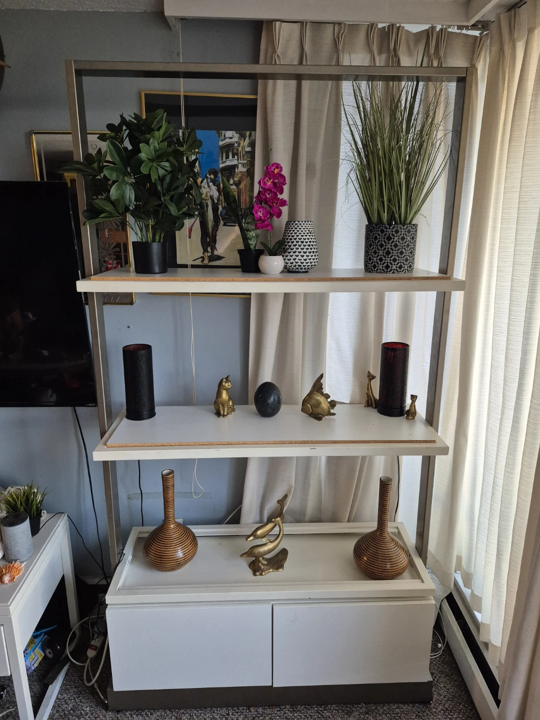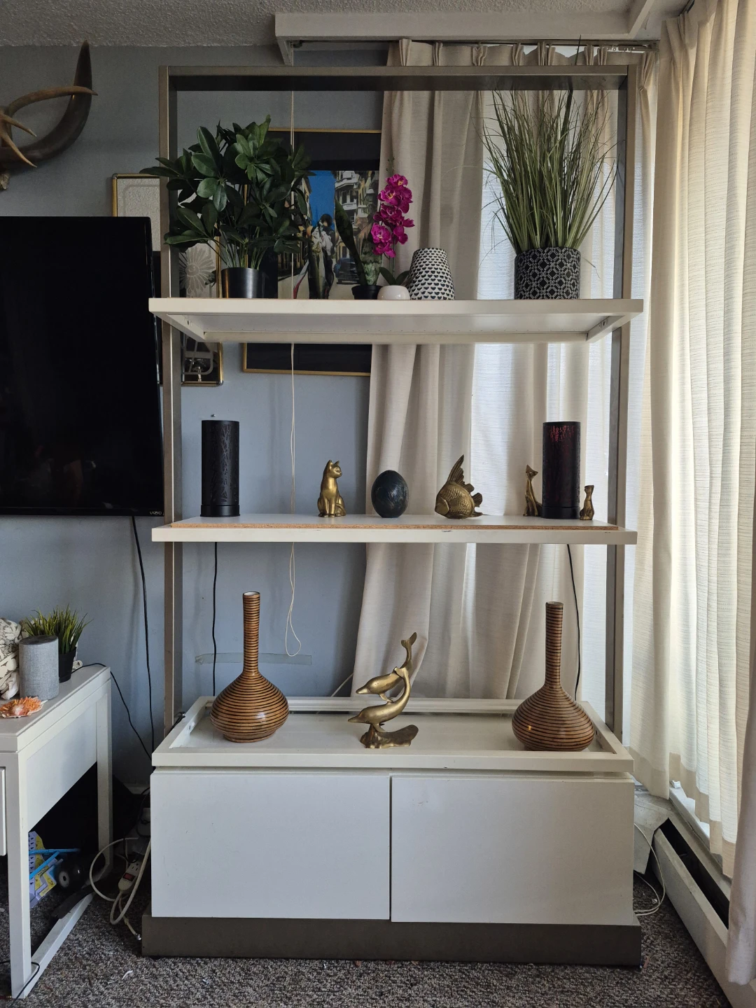 Selling a shelving unit with a white lacquer cabinet base and metal frame. Great for displaying plants and decor! The cabinet provides extra storage space, too