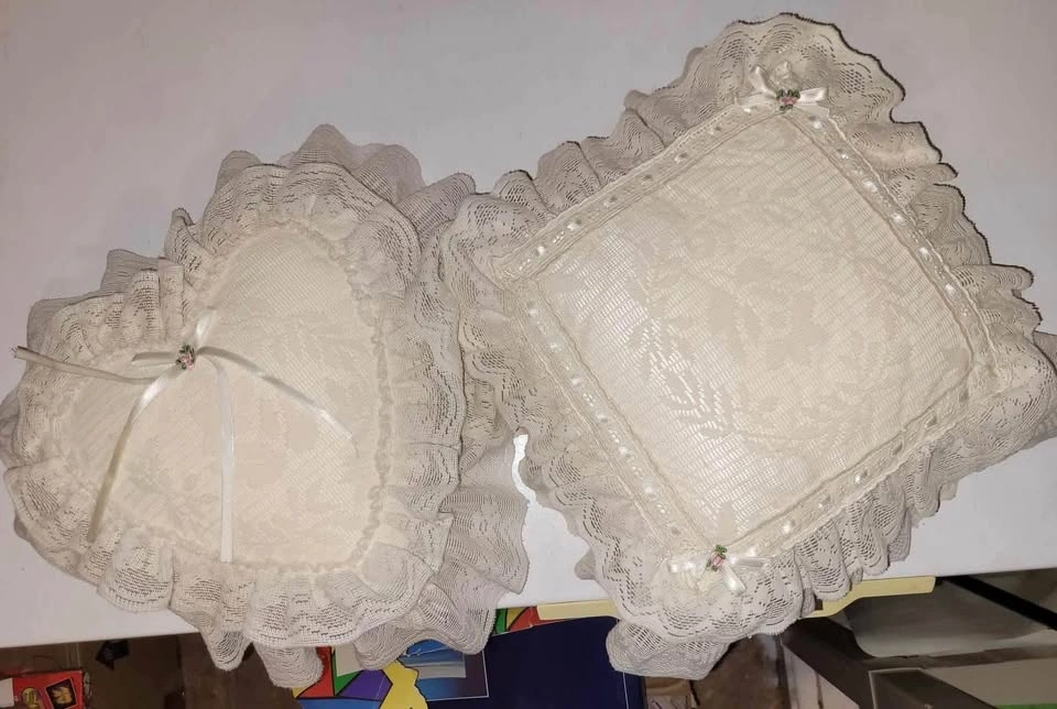 The vintage pillows are Ivory in color and measure 17” across to the lace edges. Beautiful and elegant!