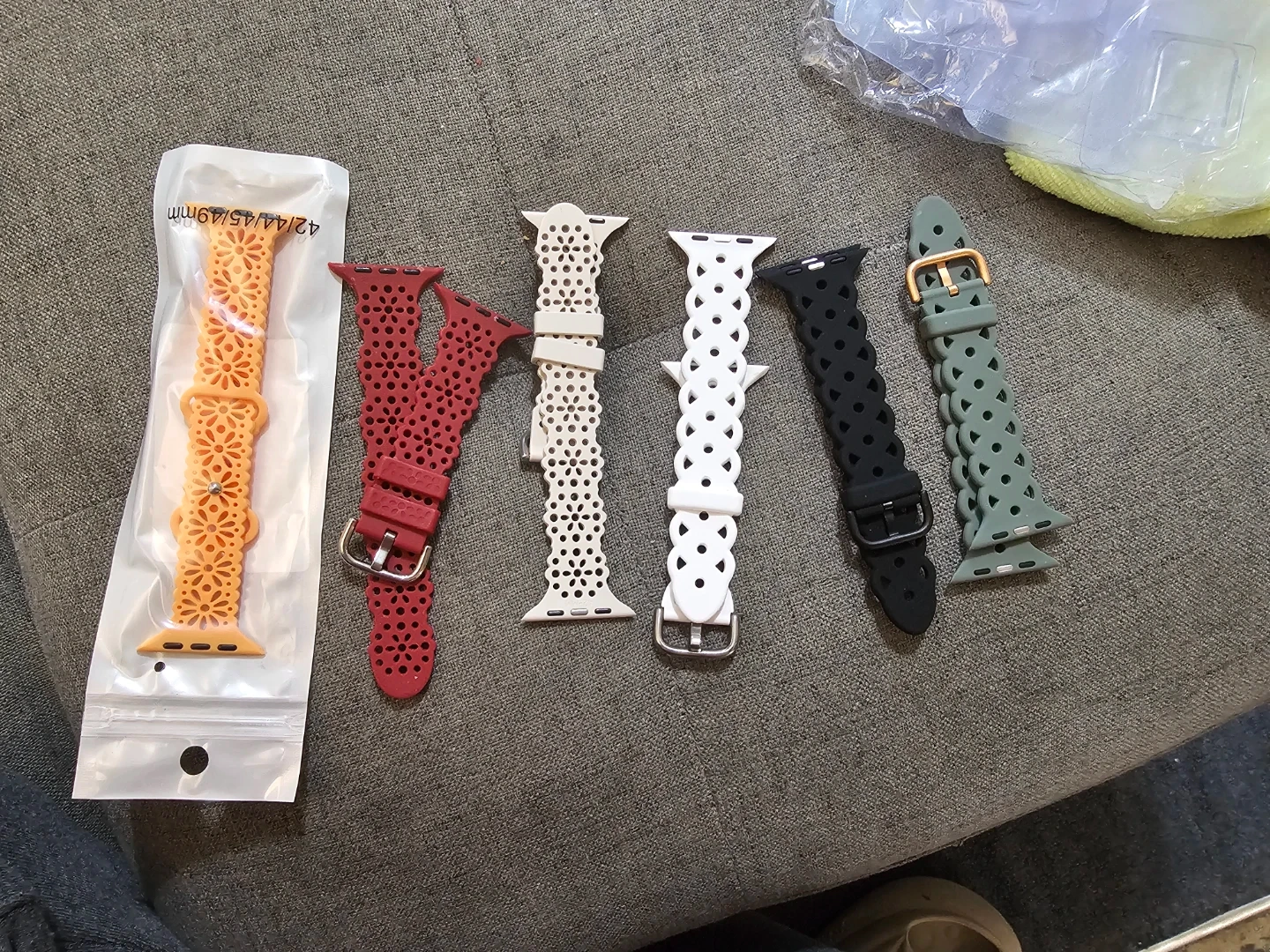 Selling a variety of Apple Watch bands, sized 49mm. They come in orange, red, white, black, and green. Great for switching up your style! Lot is $15, individual $4