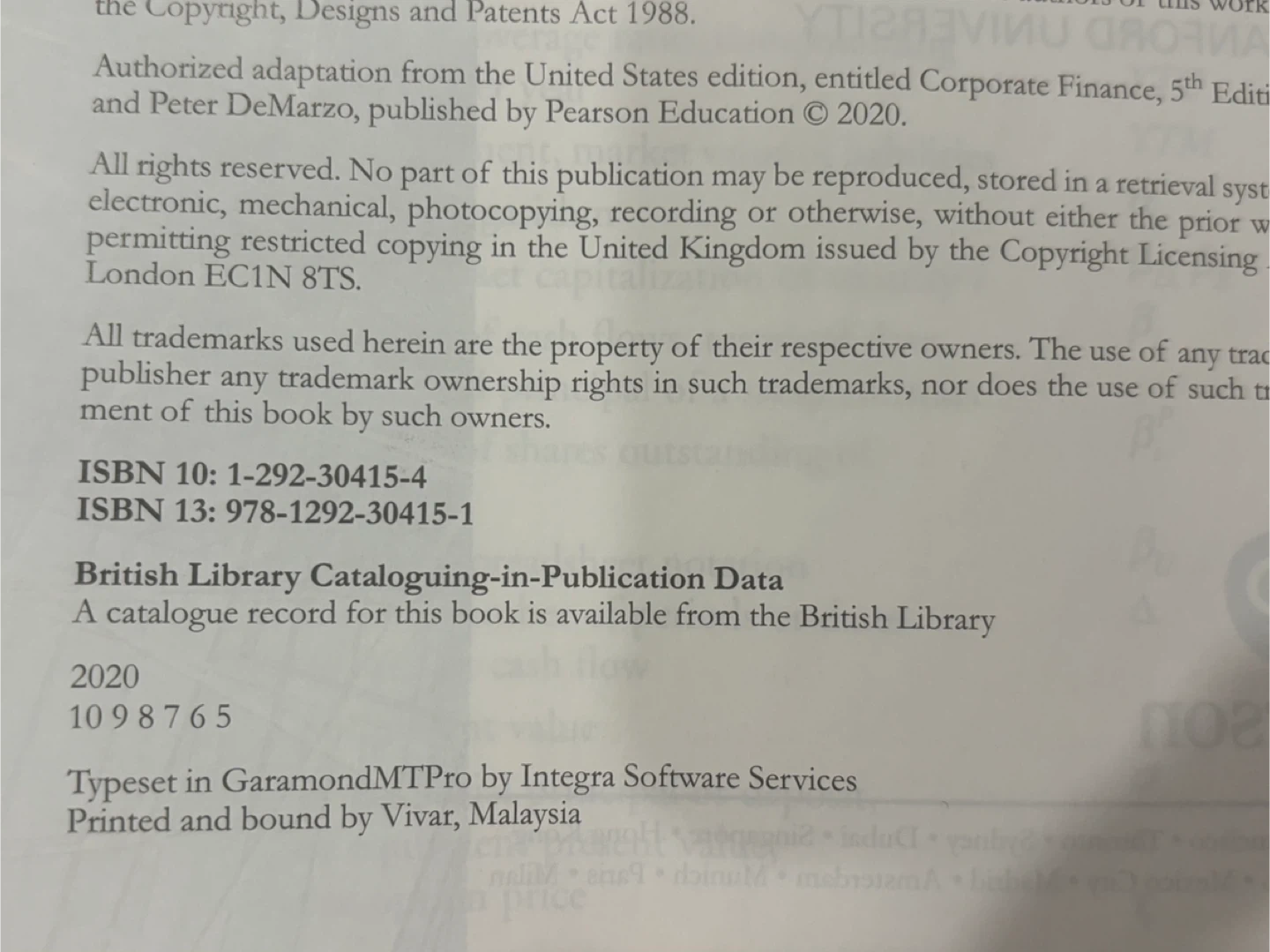 Selling Corporate Finance, Global Edition (5th Edition) by Jonathan Berk & Peter DeMarzo (ISBN‑10: 1‑292‑30415‑4, ISBN‑13: 978‑1292‑30415‑1).