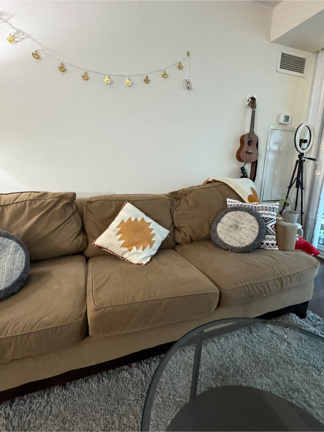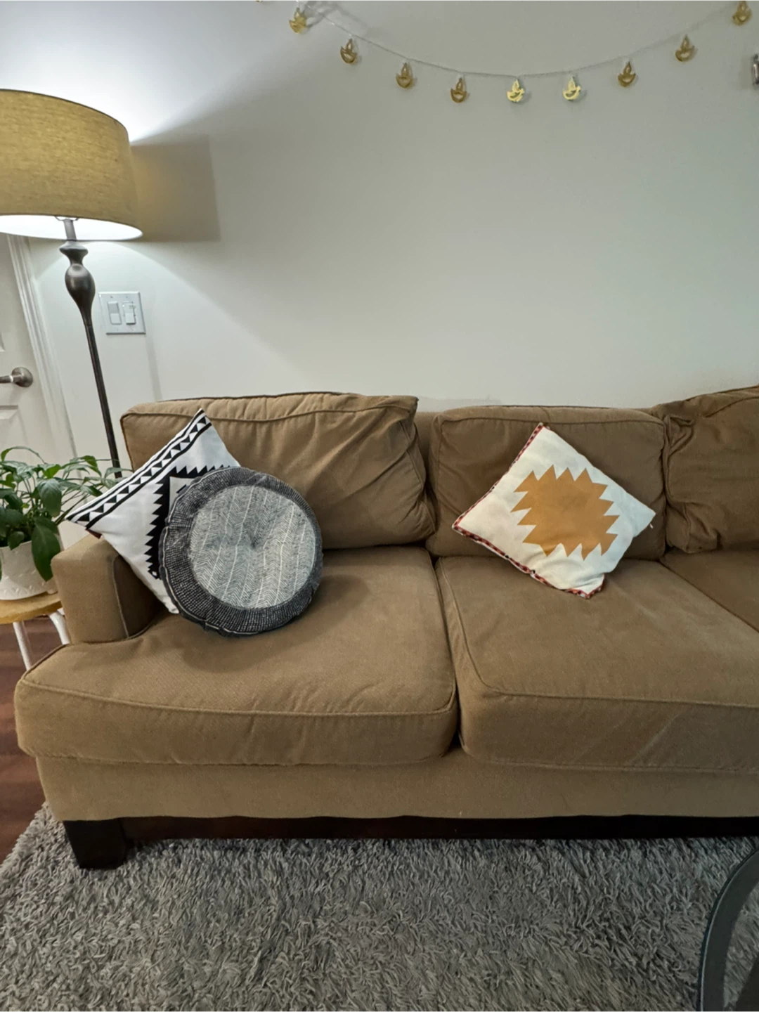 Moving out sale- Selling a cozy three-seater sofa! It's a great size for a living room and has been well-maintained. The Sofa is very comfortable and soft. We have had it for 4 years now. It has a very solid wood frame. We do not provide delivery.