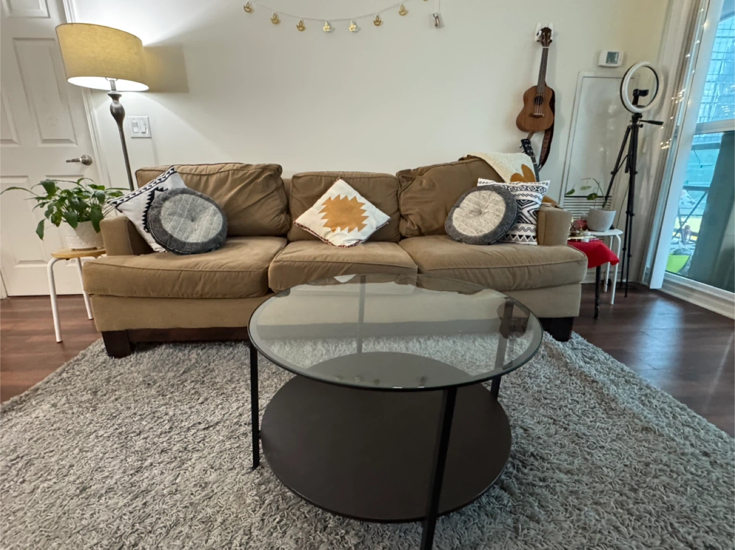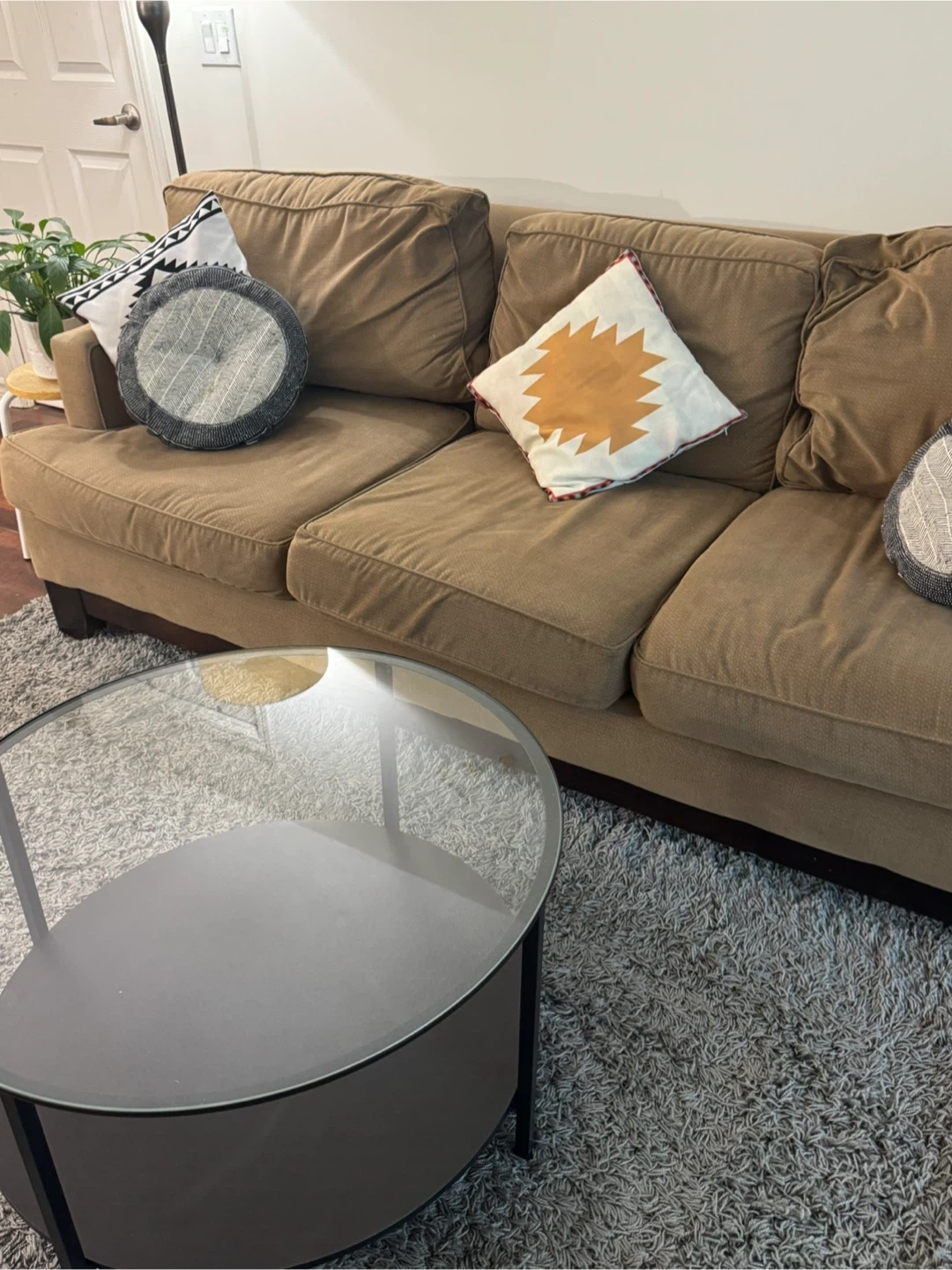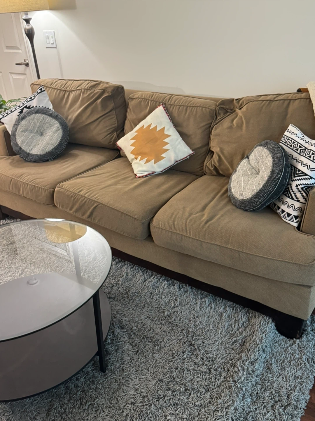 Moving out sale- Selling a cozy three-seater sofa! It's a great size for a living room and has been well-maintained. The Sofa is very comfortable and soft. We have had it for 4 years now. It has a very solid wood frame. We do not provide delivery.