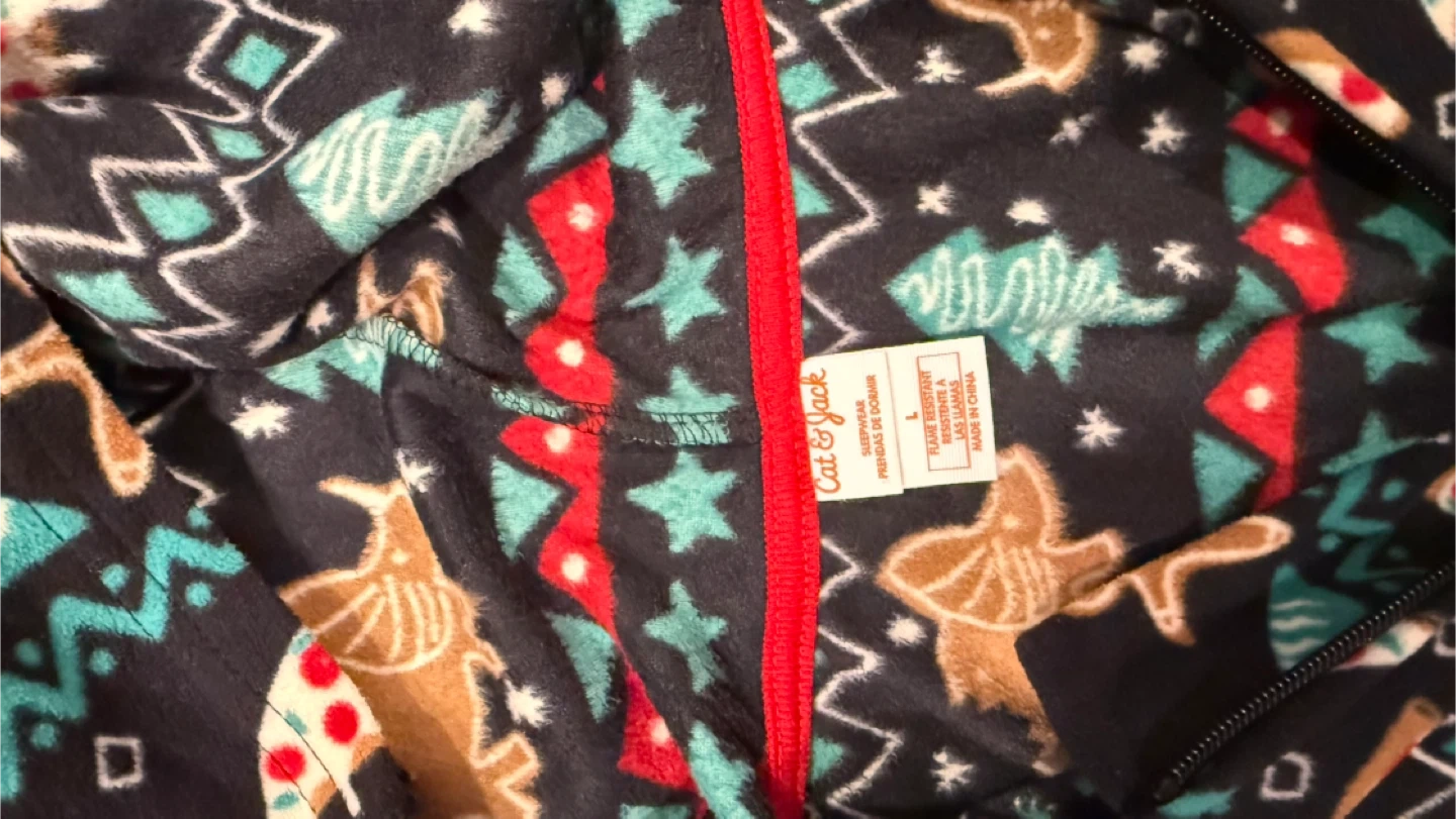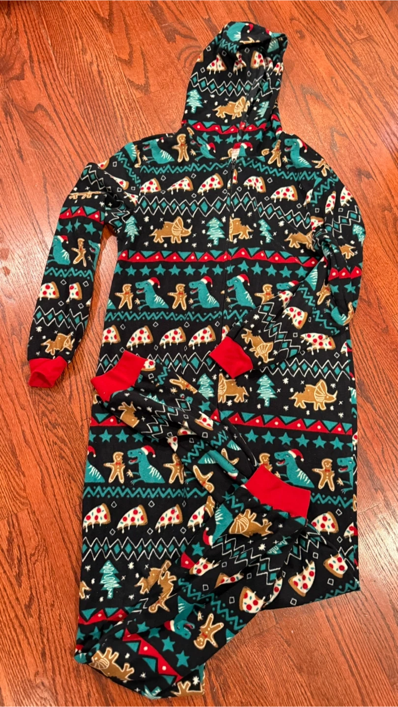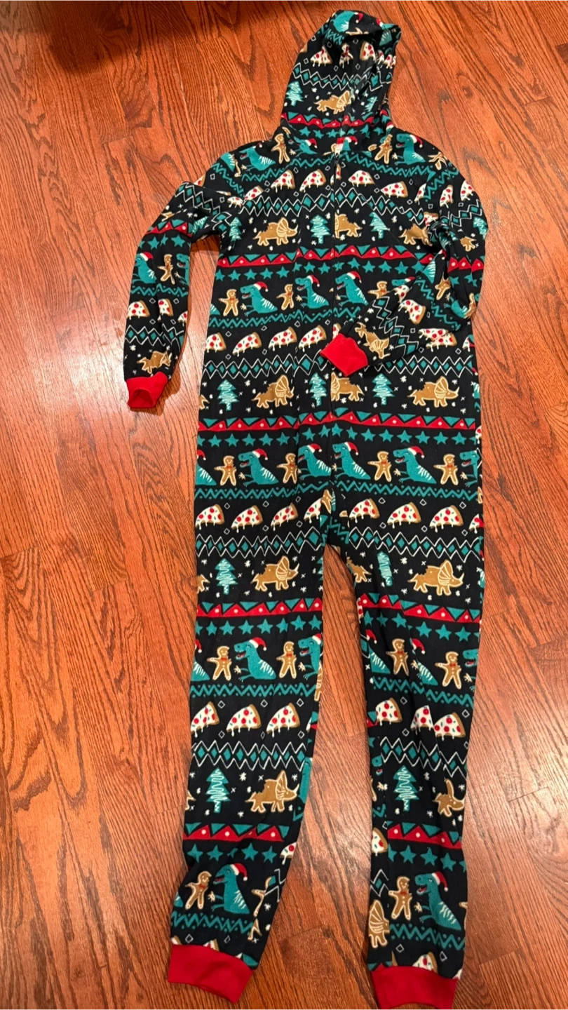 Here's a fun and festive holiday onesie from Cat & Jack! It's a size L and features a playful pattern with dinosaurs, gingerbread men, Christmas trees, and more. Perfect for cozy nights!