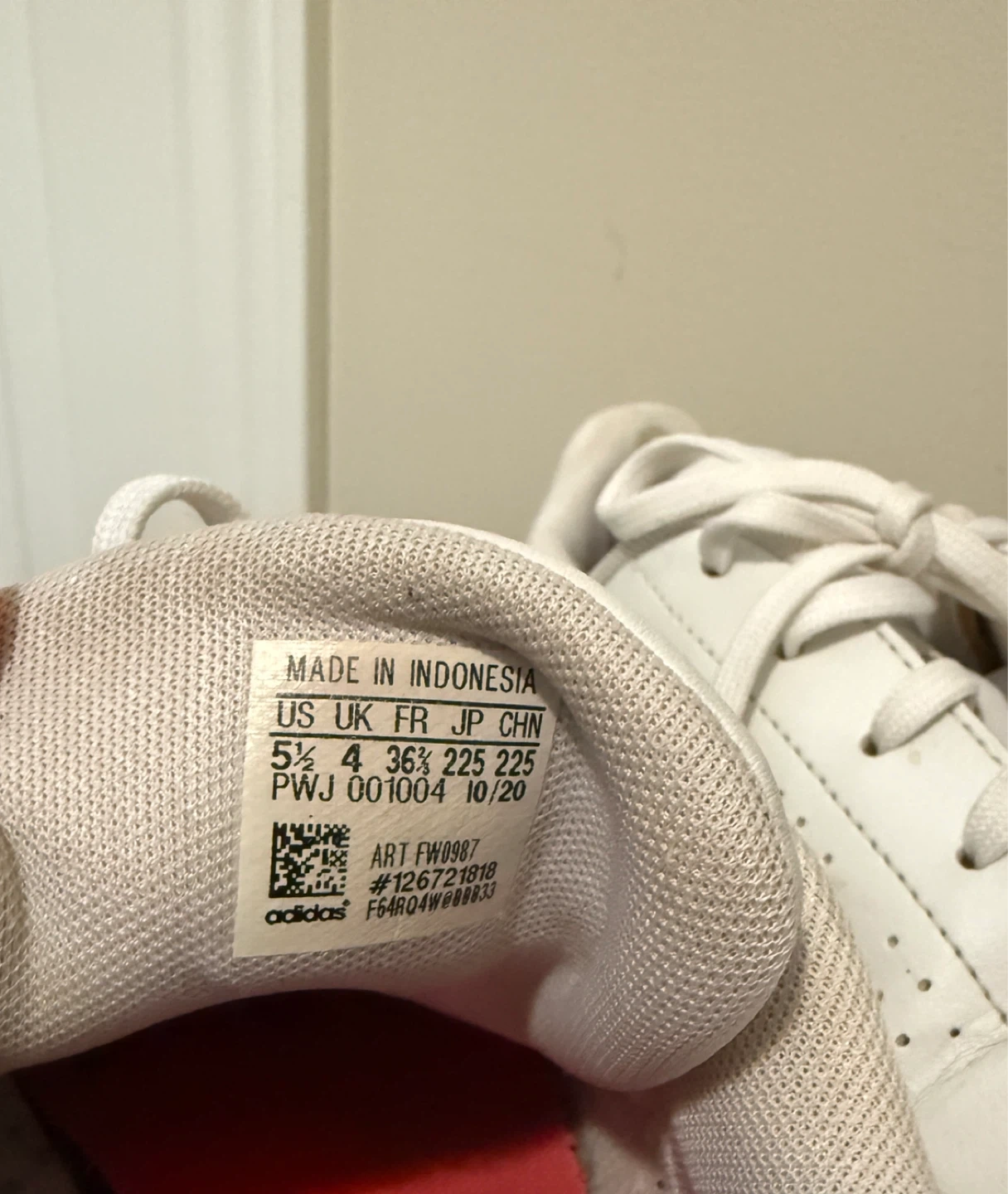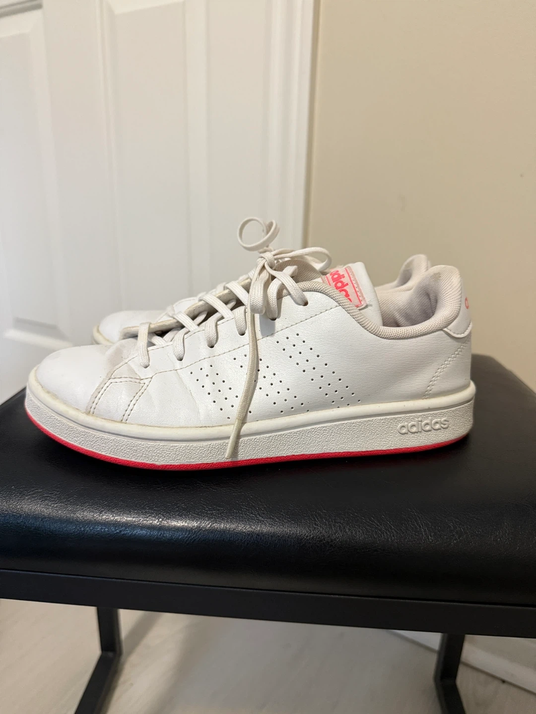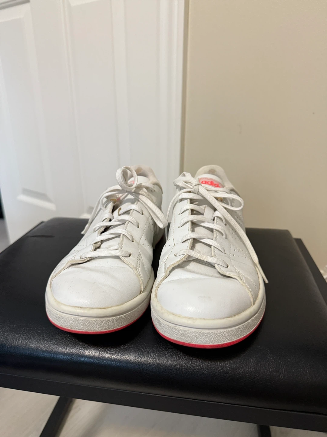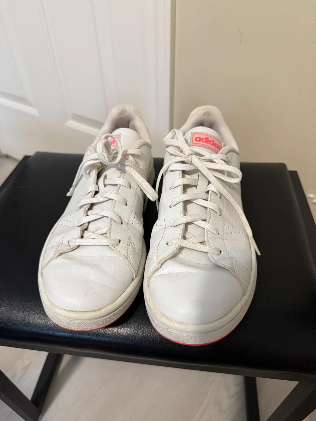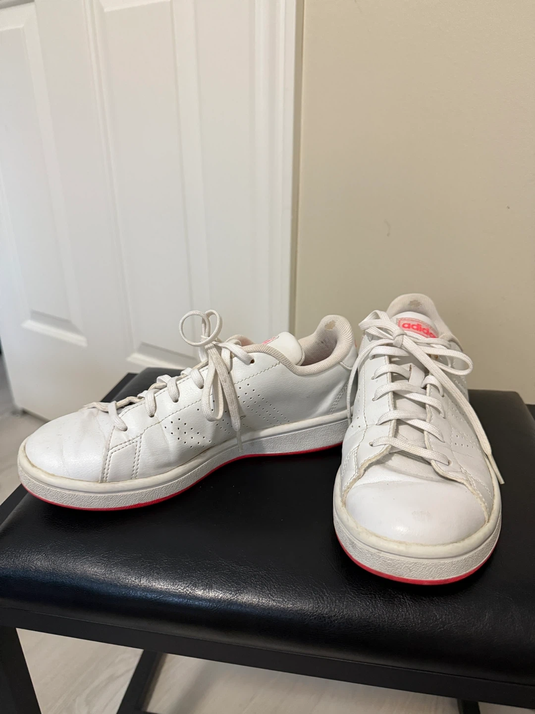 Selling a pair of Adidas Advantage sneakers in women's size US 5.5. They're white with a touch of pink. Great for everyday wear!