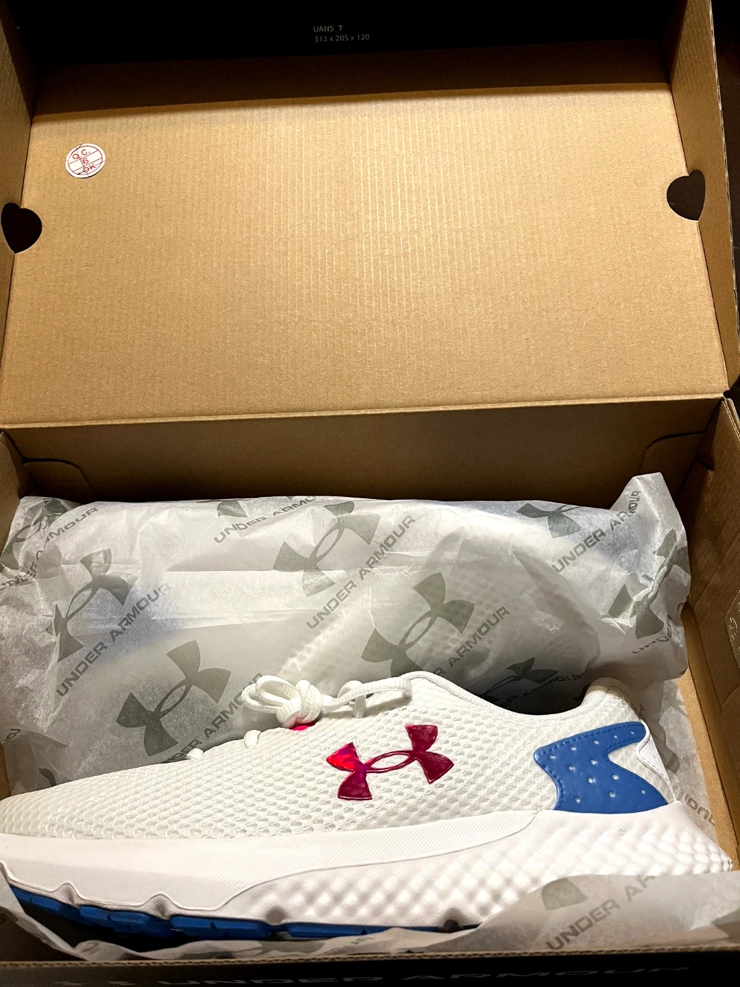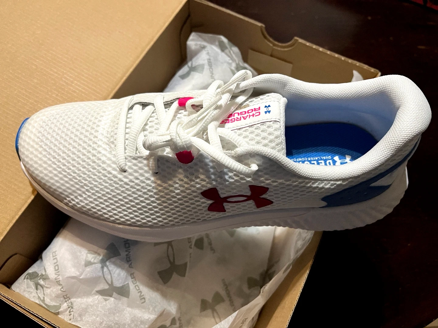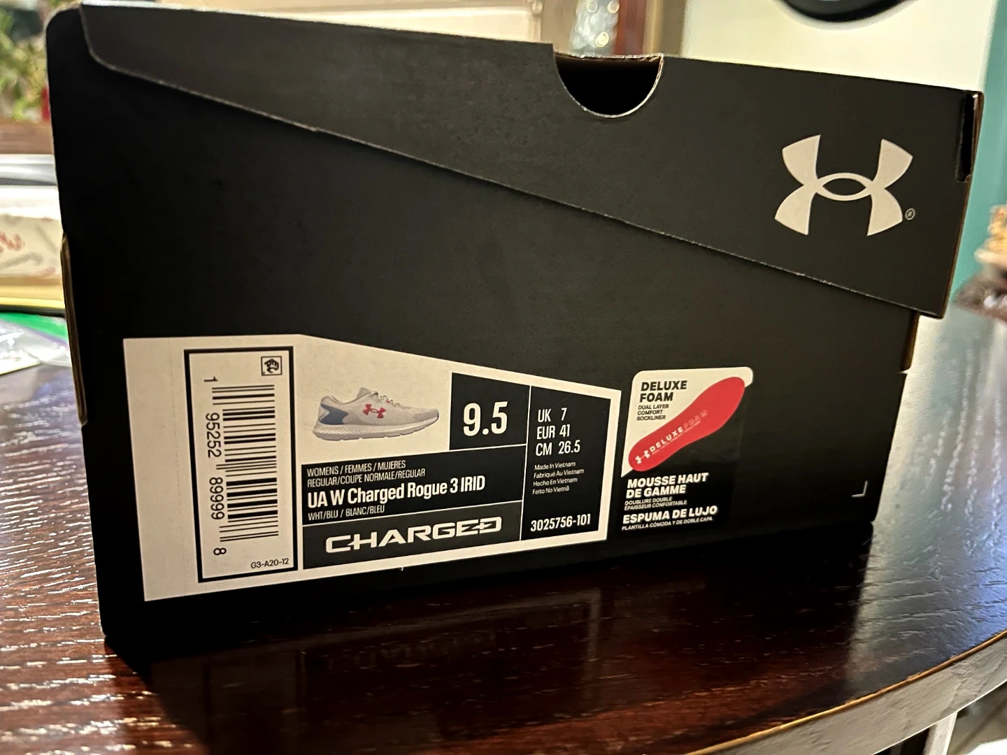 Selling a pair of Under Armour Charged Rogue 3 IRID women's running shoes in size 9.5. They come in the original box! The colour is white/blue. These shoes feature Charged Cushioning for optimal comfort and performance.