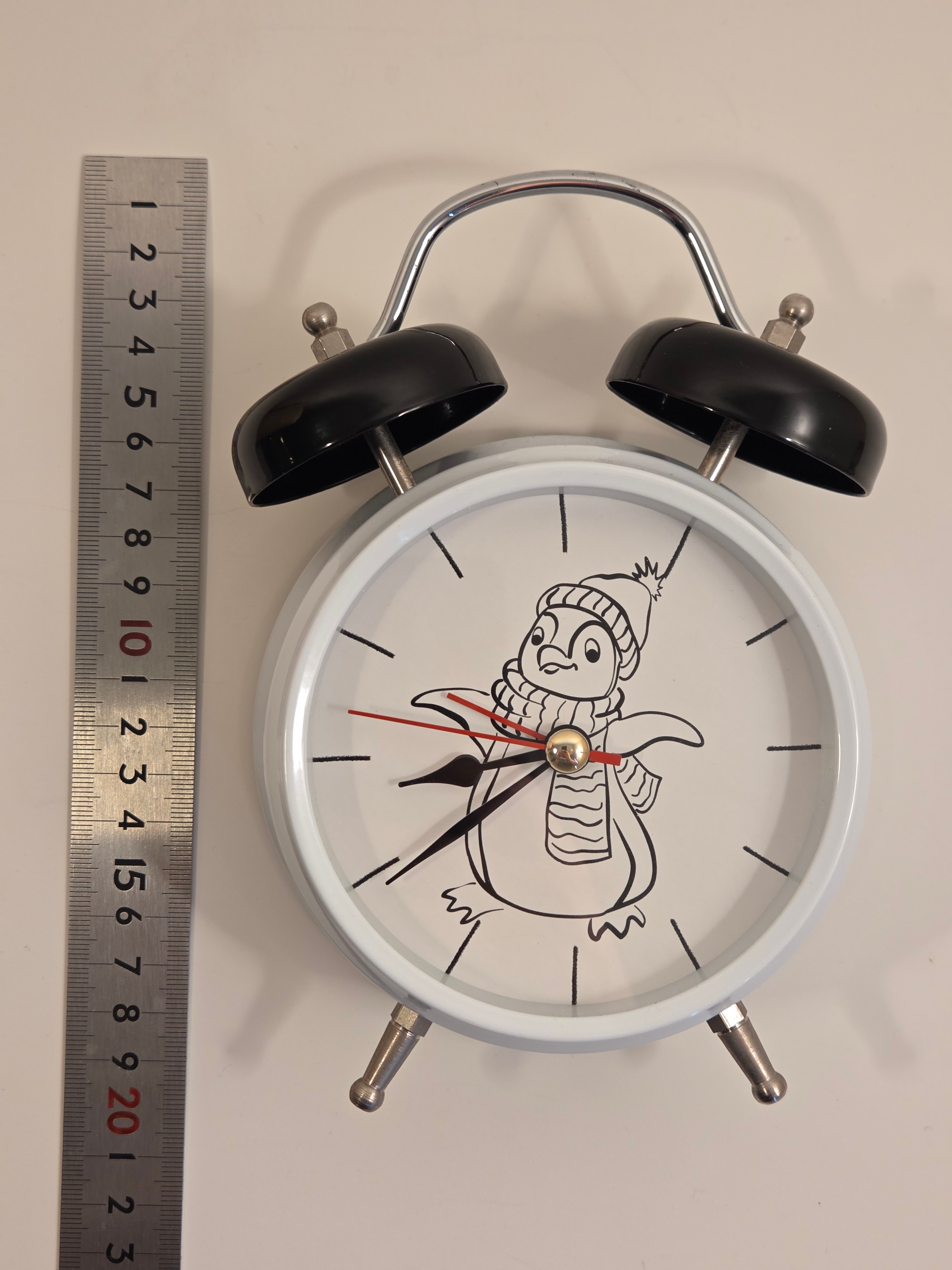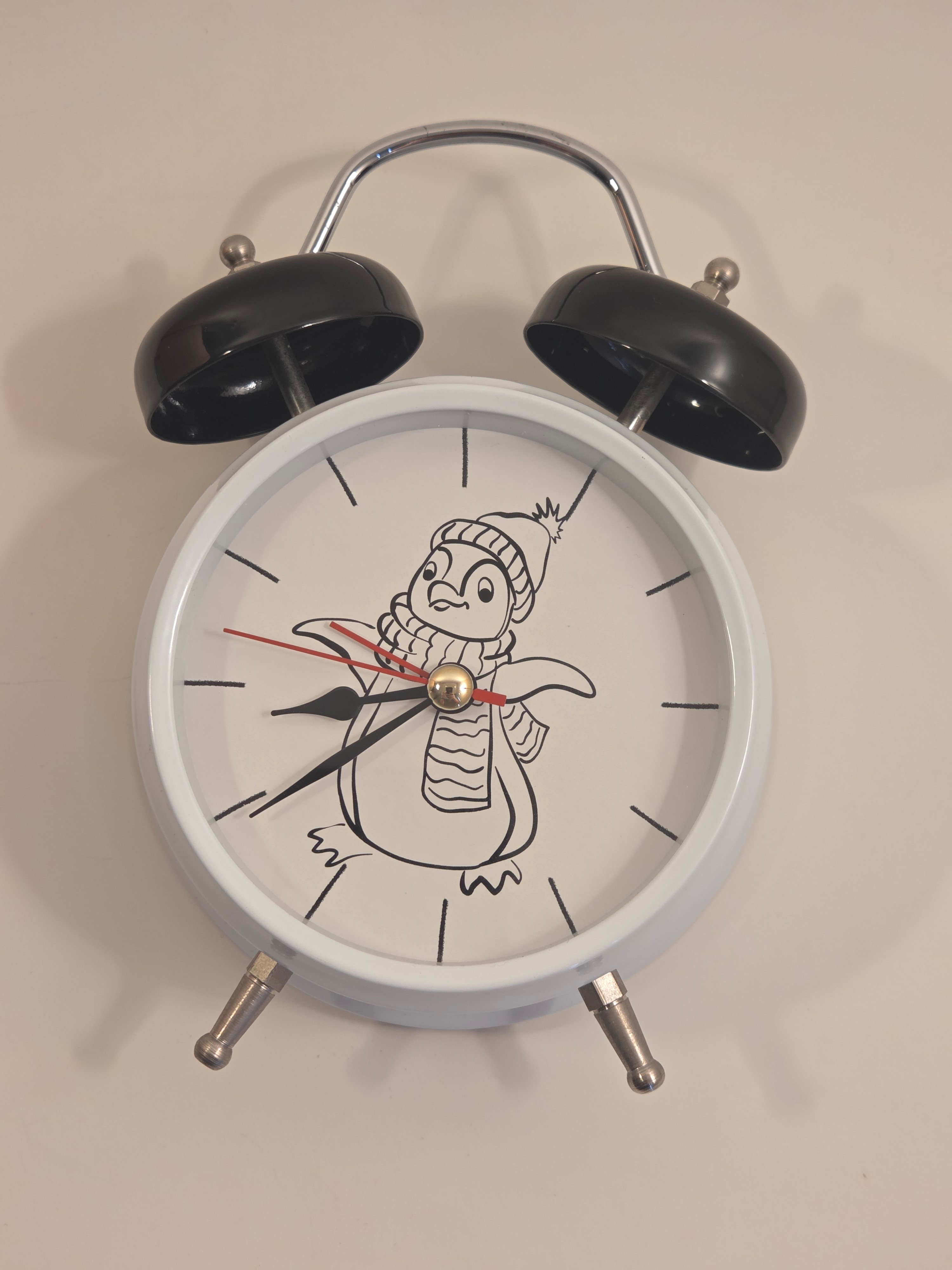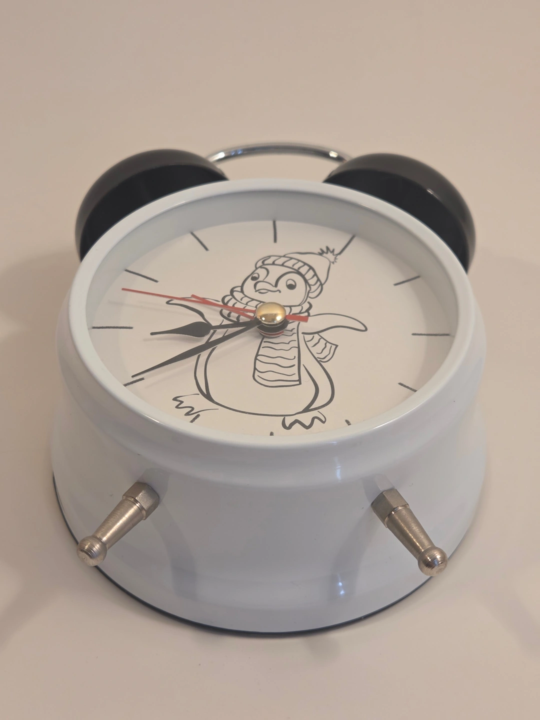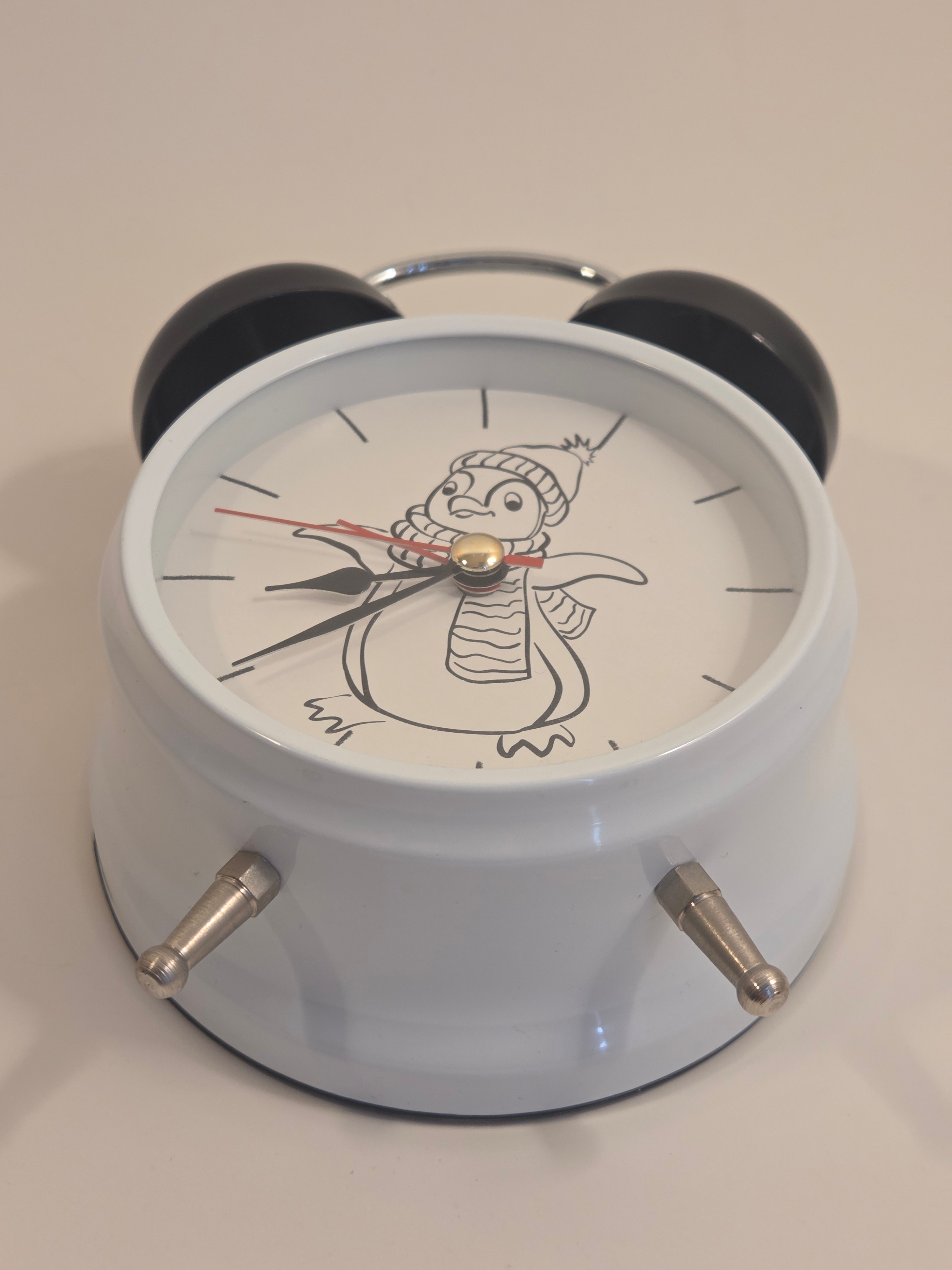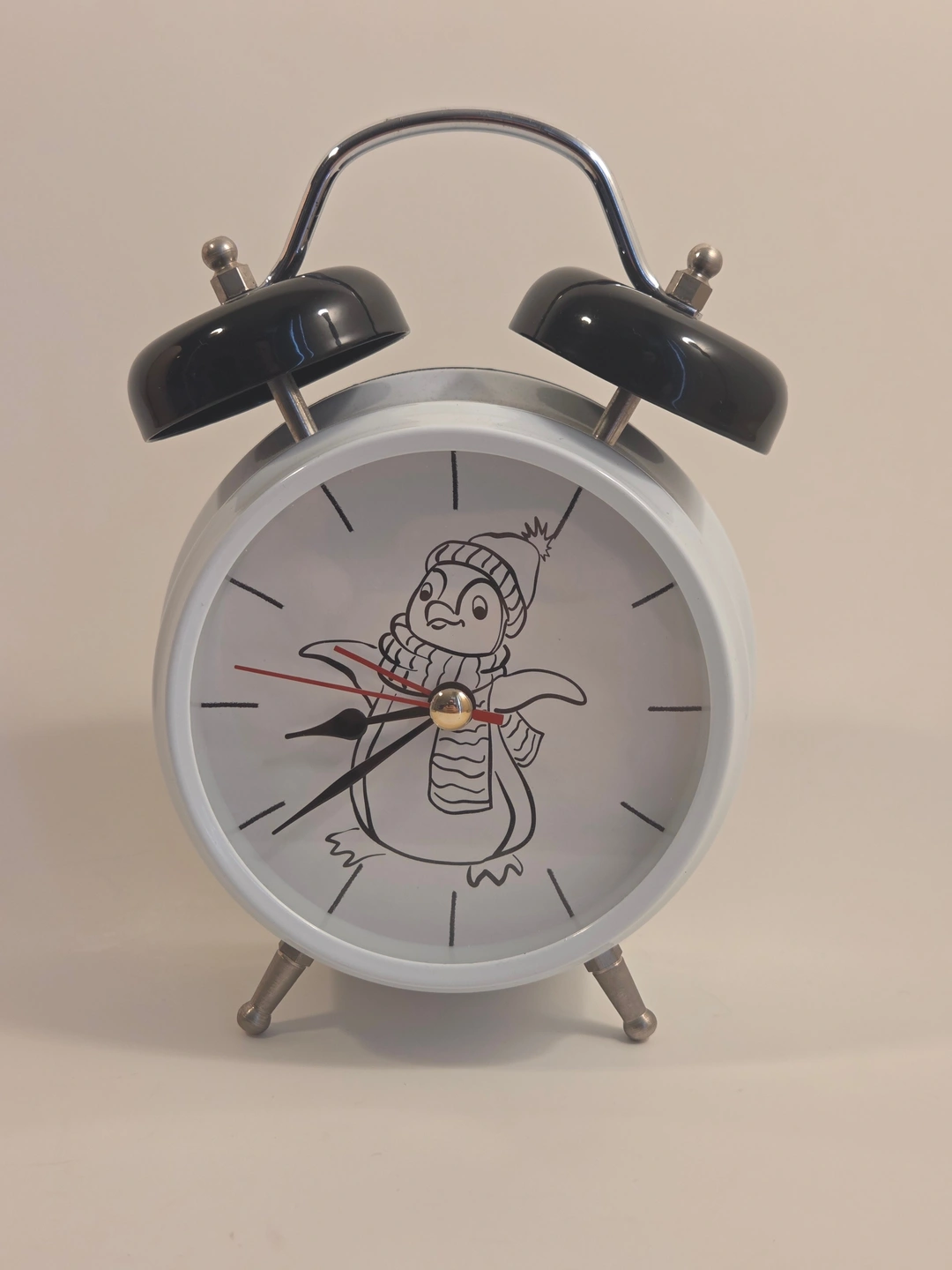 Adorable twin-bell alarm clock with a cozy penguin dial – perfect for a kid’s room or playful desk décor.