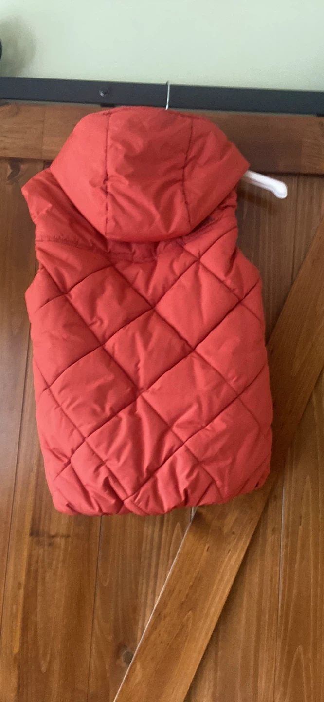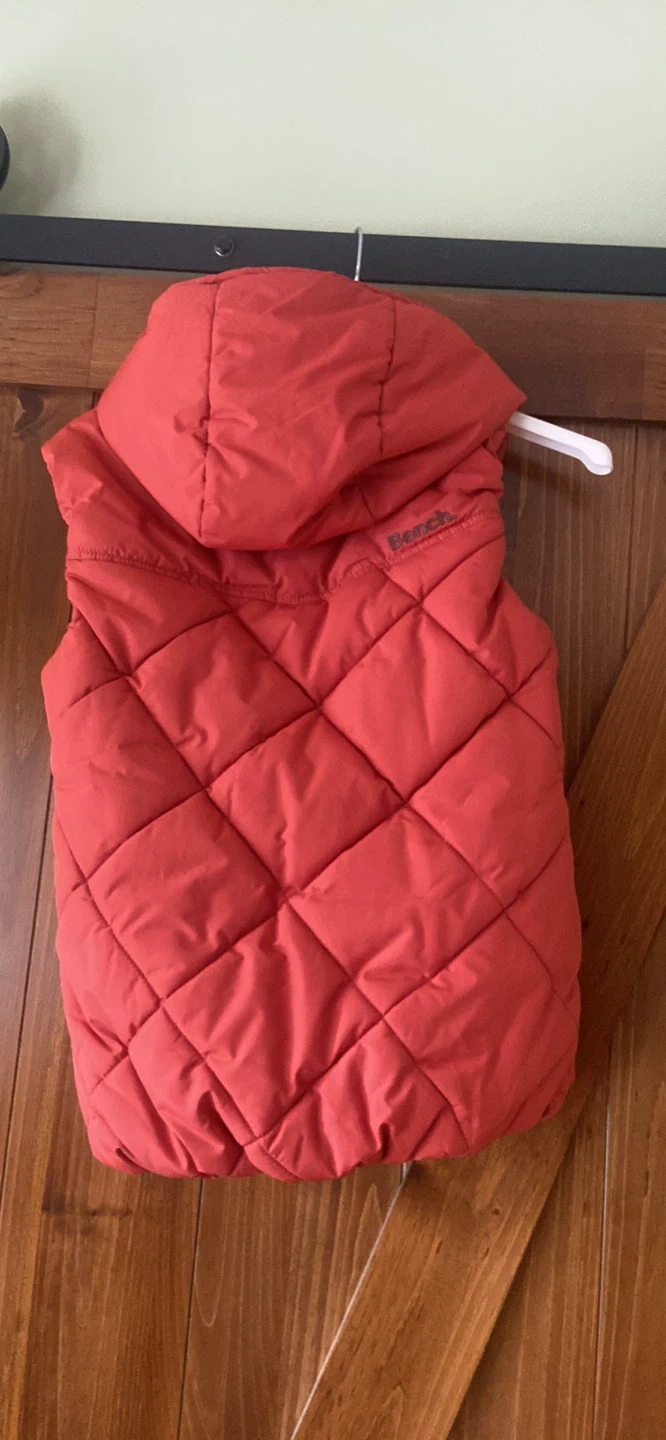 Here's a cozy Bench puffer vest in a lovely Burnt Orange colour! It's a size small and features a hood for extra warmth. Perfect for layering on chilly days! Sherpa lined