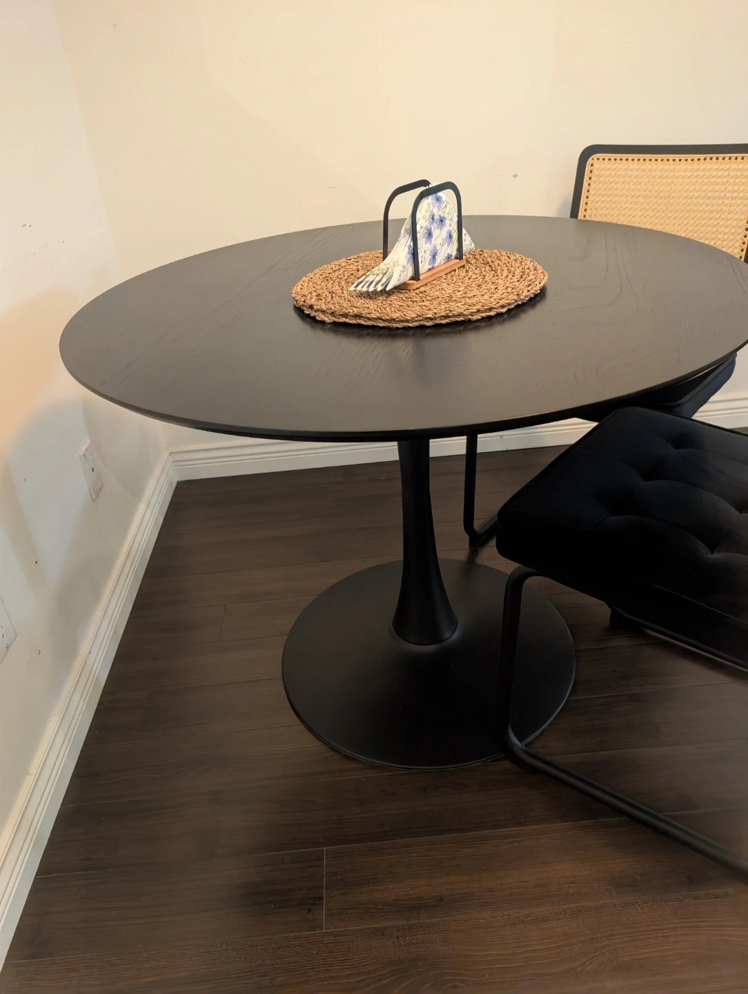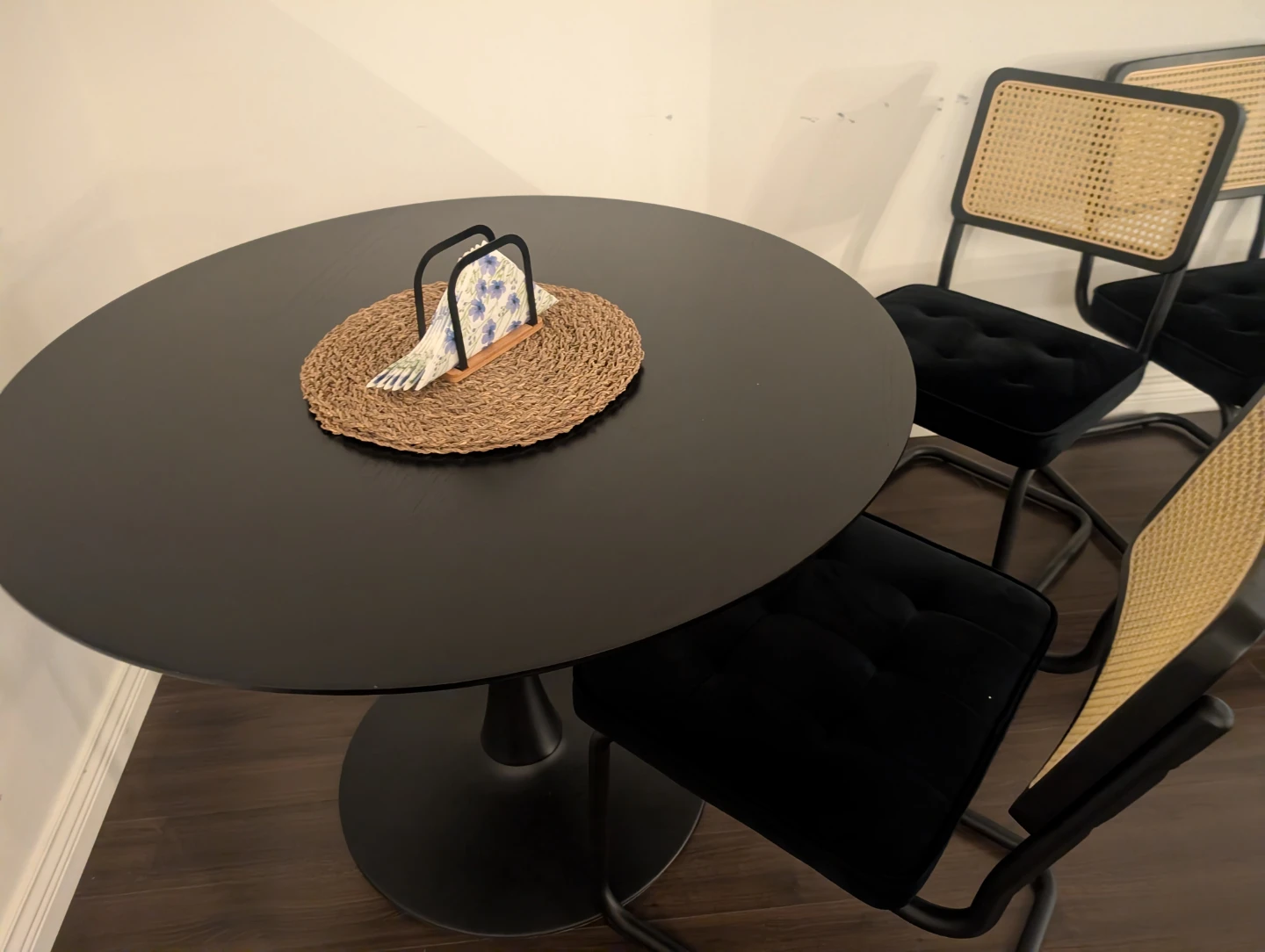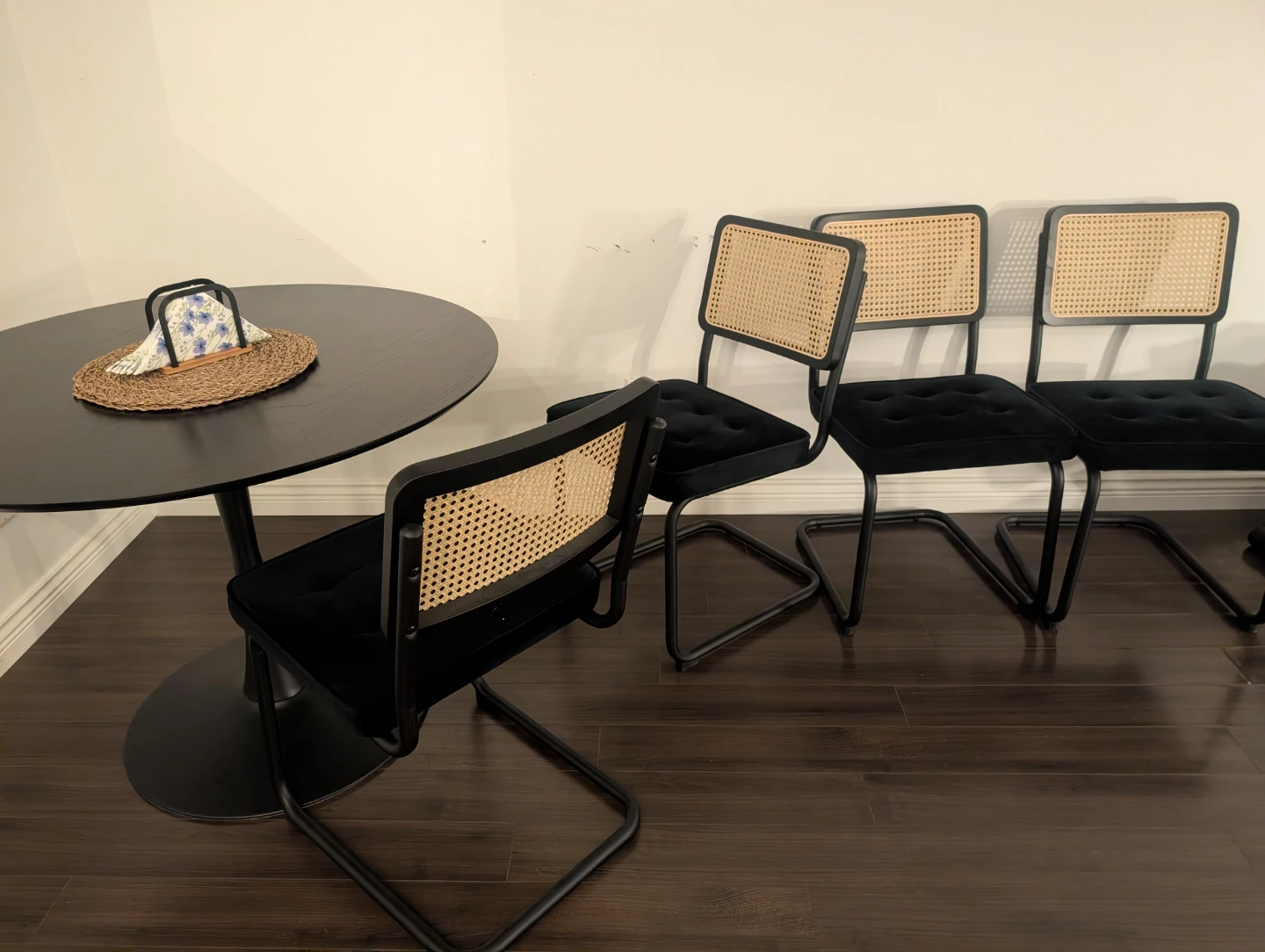 Black Table with 4 Black Rattan Dining Chairs