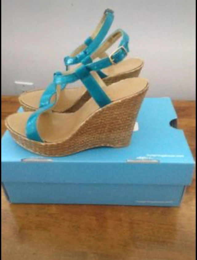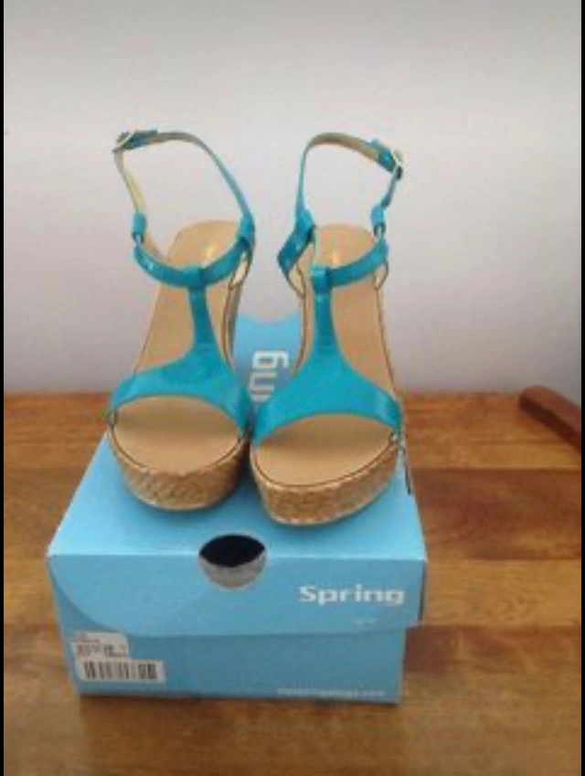 Pair of sky blue and brown Sandal toe ankle strap heel come with a box and never