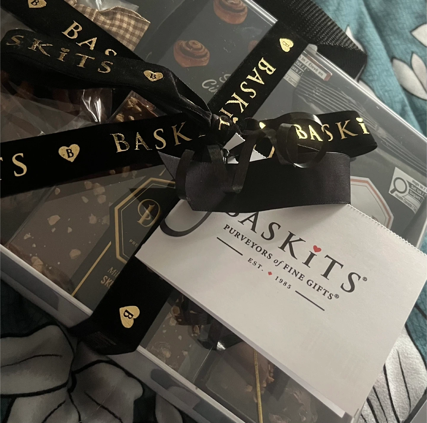 Selling a Baskits gift box, perfect for any occasion! It's filled with a selection of fine treats. The box is beautifully presented with a ribbon. A great gift idea!