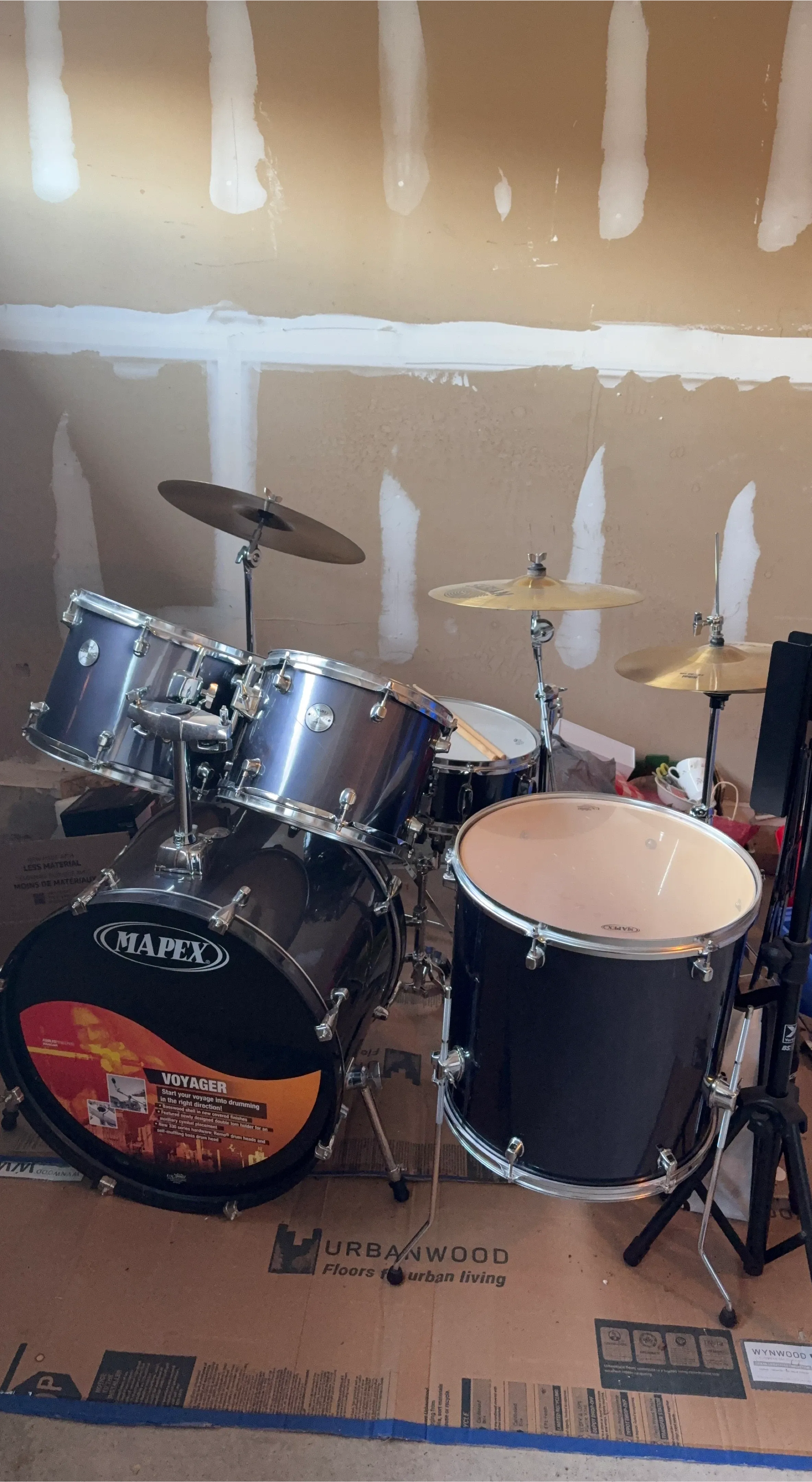 Selling a Mapex Voyager drum set! It's a great set to start your drumming voyage. It features basswood shells with new covered finishes, and a newly designed double tom holder for an auxiliary cymbal placement. Also includes new 330 series hardware and Remo drum heads