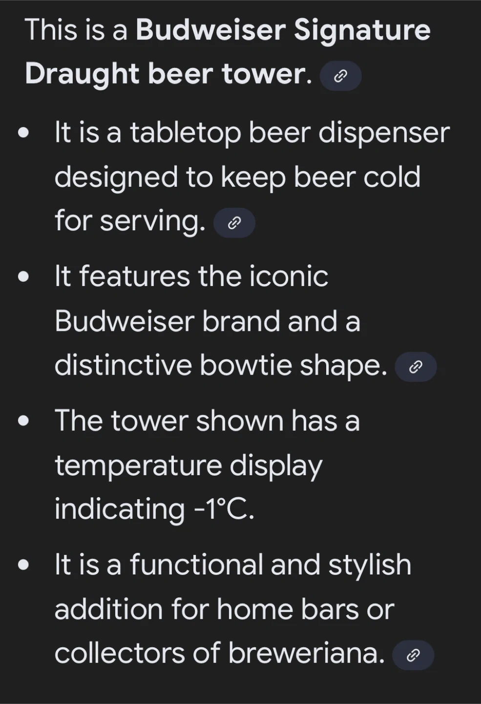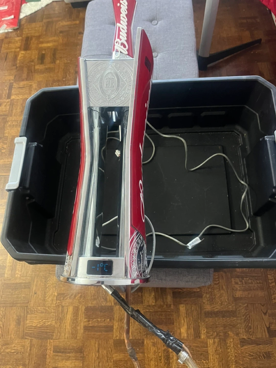 This is a Budweiser Signature Draught beer tower! It's a tabletop beer dispenser designed to keep beer cold for serving. It features the iconic Budweiser brand and a distinctive bowtie shape. The tower shown has a temperature display indicating -1°C. It's a functional and stylish addition for home bars or collectors of breweriana