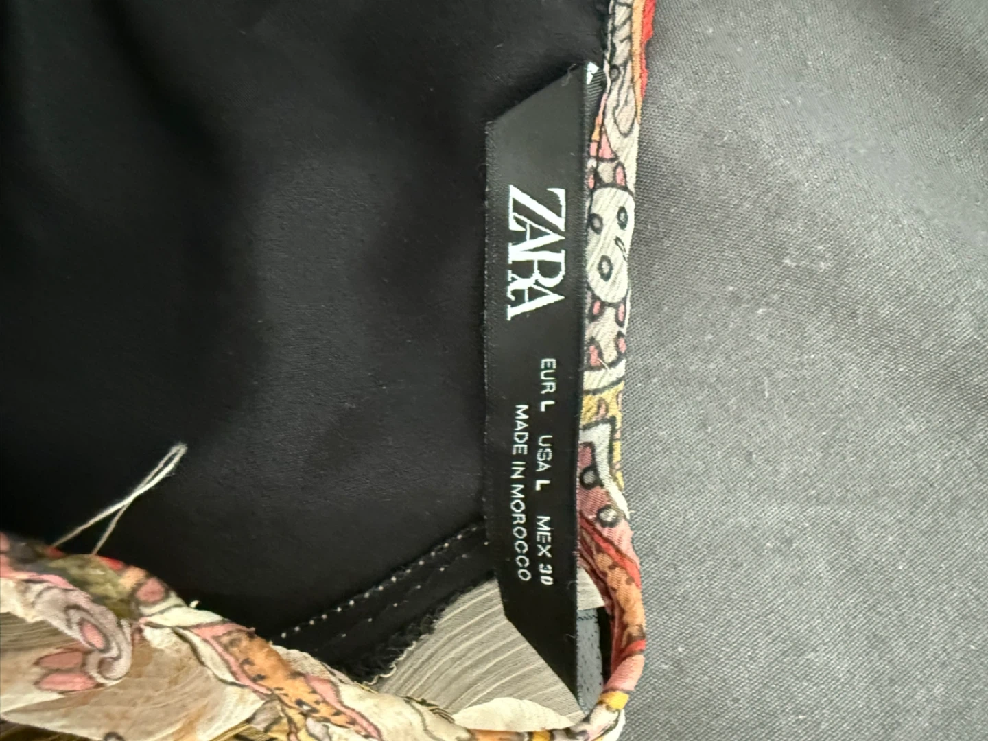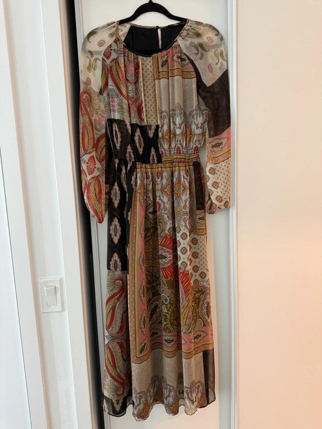 This Zara maxi dress has a beautiful patchwork print. It's a size large with long sleeves. Made in Morocco.